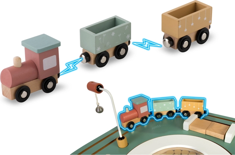 Mašinka s vagónikmi na magnet môže jazdiť po celej doske stola. Deti plánujú trasu, prevážajú zvieratká a rozvíjajú predstavivosť aj jemnú motoriku.