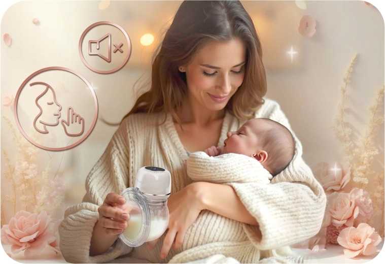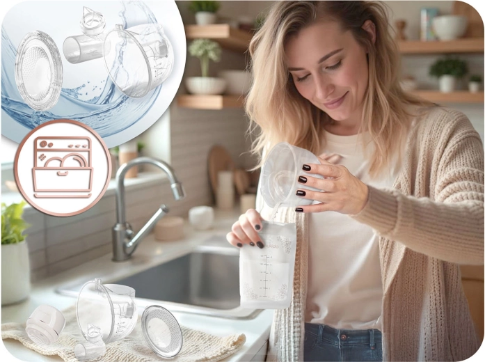 Skutočná sloboda pohybu – odsávačka je bezdrôtová a na jedno nabitie cez USB‑C vydrží približne 3 hodiny prevádzky. Kompaktný tvar umožňuje diskrétne použitie doma, v práci aj na cestách. Súčasťou je klips na úpravu ramienka podprsenky pre pohodlné hands‑free odsávanie. Všetky neelektrické časti možno umývať v umývačke riadu (okrem elektronického panela) a materiály sú bez BPA a s antibakteriálnymi vlastnosťami.