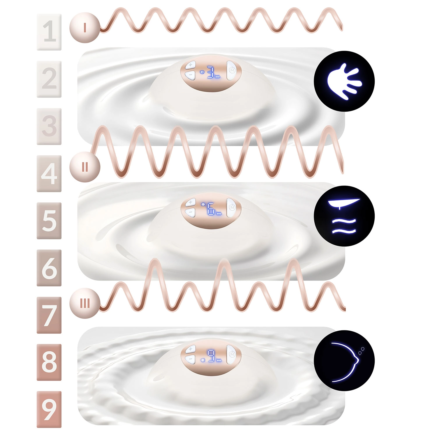 - 9 úrovní intenzity v každej fáze – jemné aj silnejšie nastavenie podľa potreby.