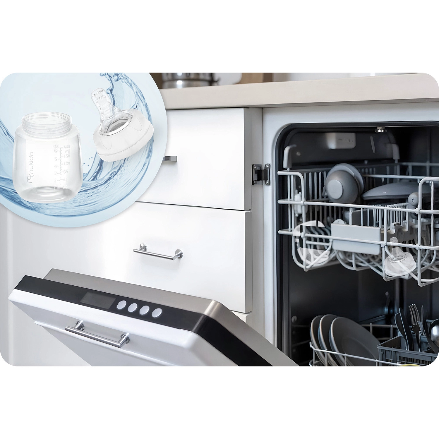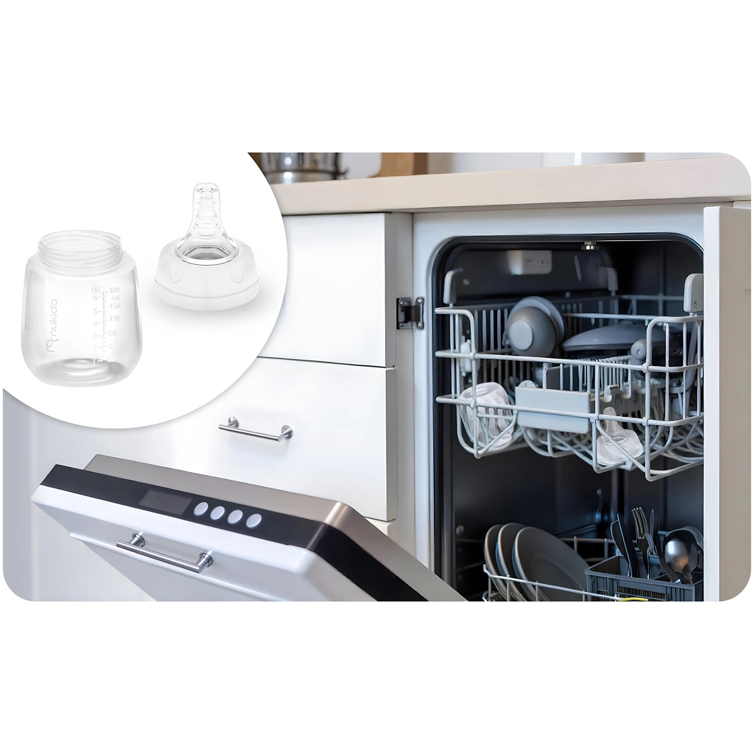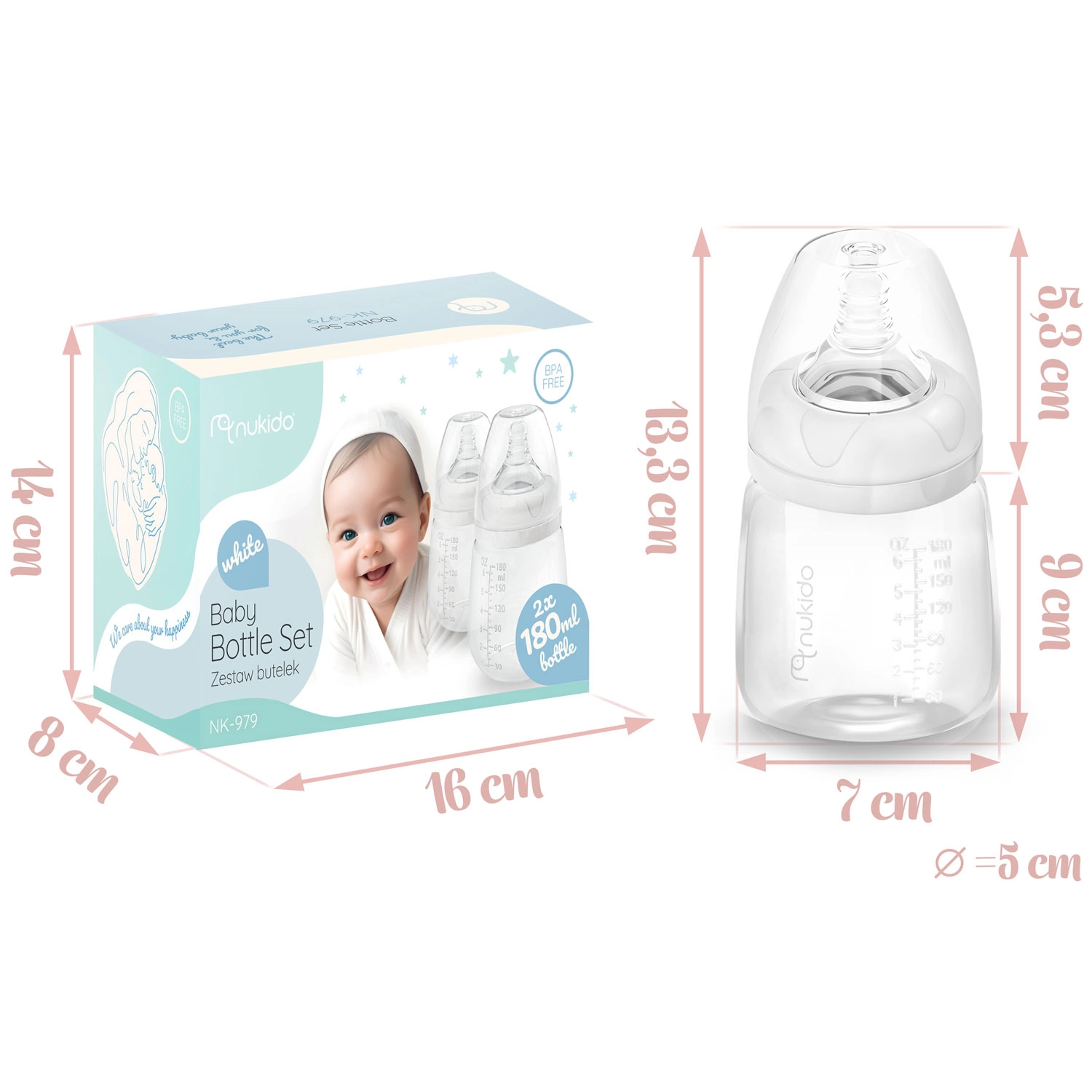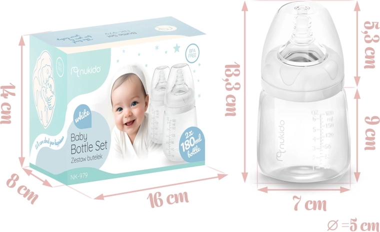 Súprava NUKIDO prináša dve odolné a opakovane použiteľné fľaštičky s objemom 180 ml, vyrobené z ľahkého a nerozbitného polypropylénu. Vďaka širokému hrdlu je plnenie aj čistenie rýchle a hygienické, čitateľné rysky zase umožňujú presné dávkovanie. Súčasťou sú krytky a zátky proti úniku, takže mlieko či výživu bezpečne uskladníte aj na cesty.