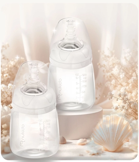 Praktická súprava dvoch kojeneckých fliaš s objemom 180 ml z bezpečného polypropylénu na každodenné kŕmenie. Fľaštičky sú ľahké, ľahko sa držia a majú čitateľné odmerné rysky, široké hrdlo na jednoduché čistenie a dynamický silikónový cumlík napodobňujúci pohyb materskej bradavky. Sú bez BPA, kompatibilné s odsávačkami NUKIDO a možno ich umývať v umývačke aj ručne.