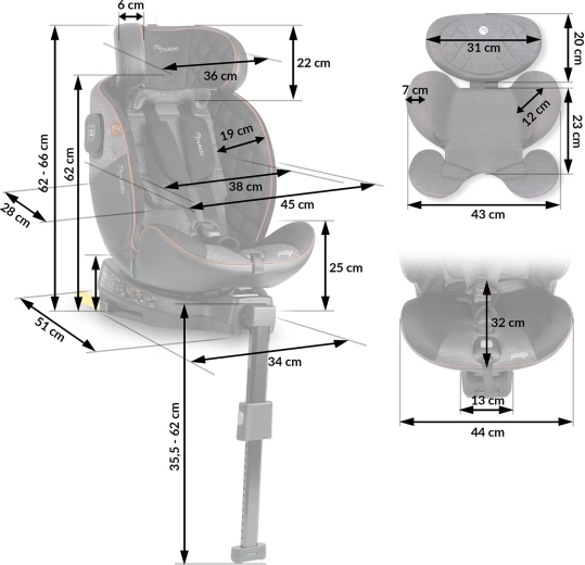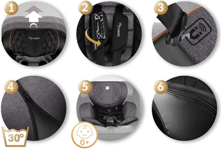Pre najmenších slúži 5-bodový bezpečnostný pás a ergonomická novorodenecká vložka. Väčším deťom ponúkne sedačka vedenie automobilového pásu cez 4 kotevné body a prispôsobenie rastu vďaka 12 úrovniam nastavenia opierky hlavy a 5-stupňovému náklonu. Prémiové materiály, mäkké polstrovanie s prešívaním a inteligentne riešené detaily (magnety na odkladanie pásov, protišmykové návleky) zvyšujú komfort aj každodennú praktickosť.