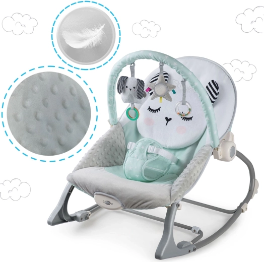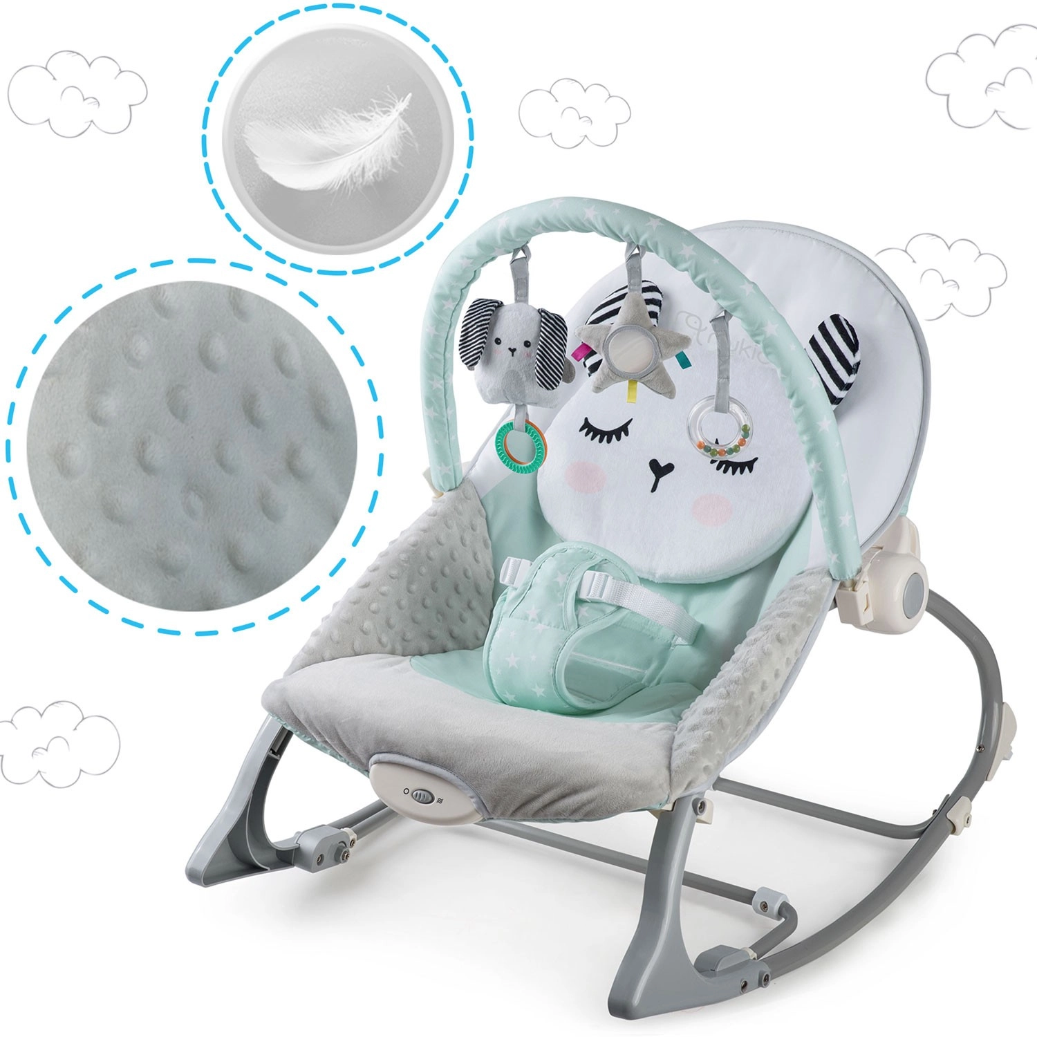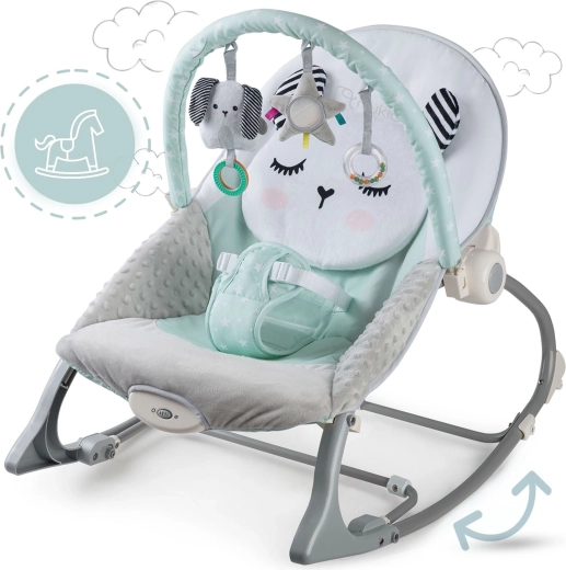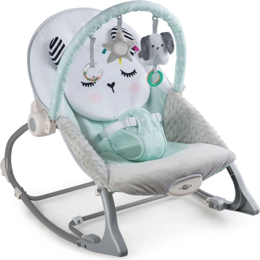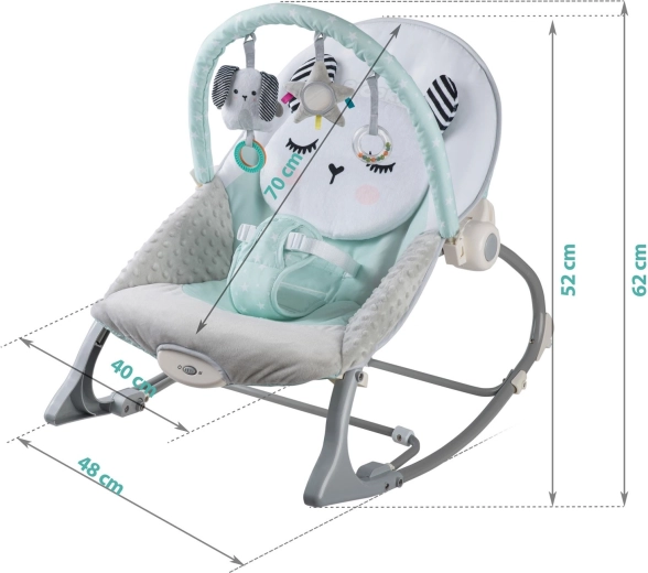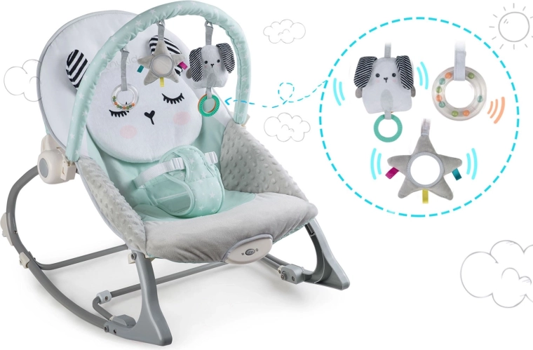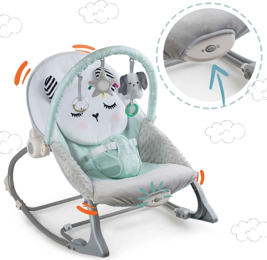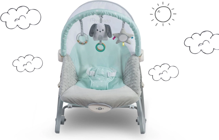 Multifunkčné detské lehátko NUKIDO v mätovej farbe prináša pokoj pre bábätko a voľné ruky pre rodičov. Ponúka upokojujúce vibrácie, jemné hojdanie s možnosťou blokácie, odnímateľnú hrazdičku s hračkami pre zmyslovú stimuláciu a mäkké, pohodlné polstrovanie. O bezpečie sa starajú 3-bodové pásy a protisklzové nôžky.