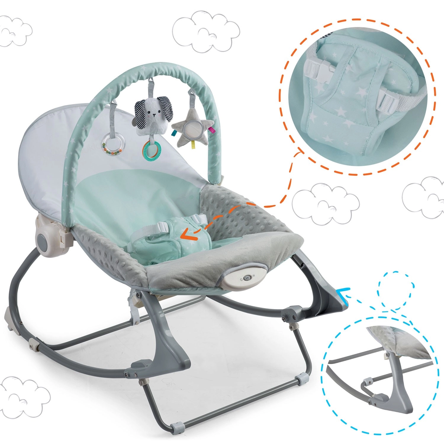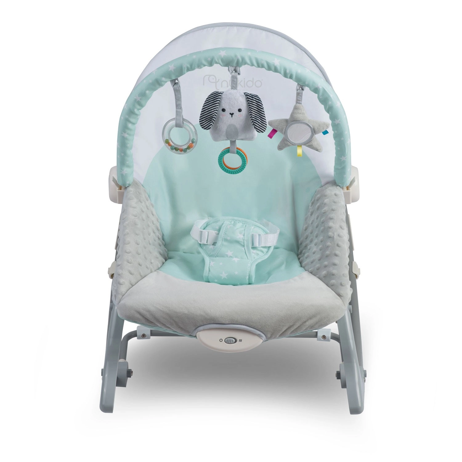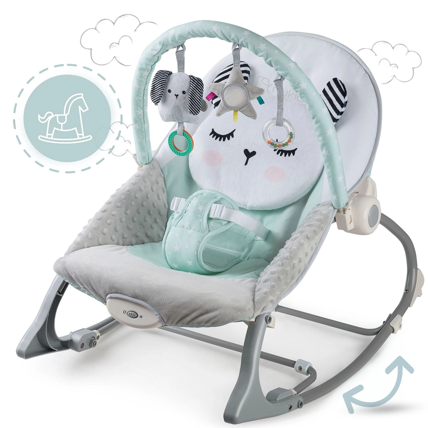 Multifunkčné detské lehátko NUKIDO v mätovej farbe prináša pokoj pre bábätko a voľné ruky pre rodičov. Ponúka upokojujúce vibrácie, jemné hojdanie s možnosťou blokácie, odnímateľnú hrazdičku s hračkami pre zmyslovú stimuláciu a mäkké, pohodlné polstrovanie. O bezpečie sa starajú 3-bodové pásy a protisklzové nôžky.