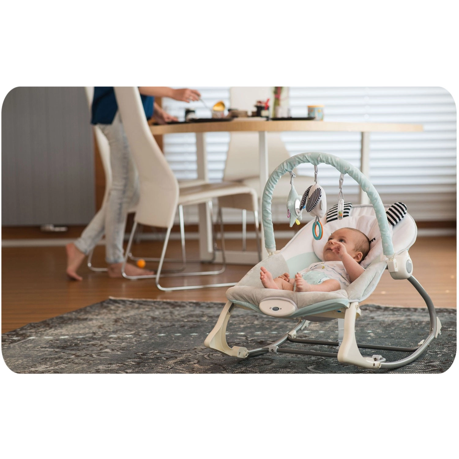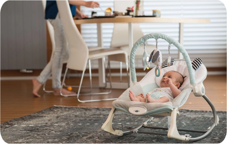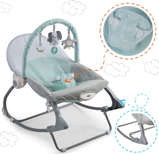 Kovový rám, protisklzové nôžky a 3-bodové pásy držia bábätko v správnej polohe. Blokácia hojdania umožní stabilné sedenie.