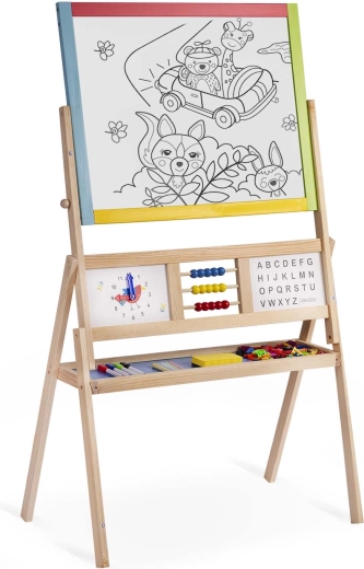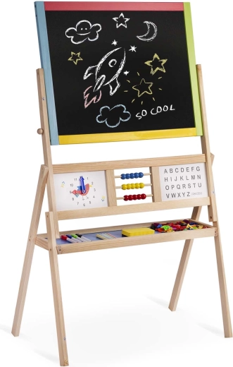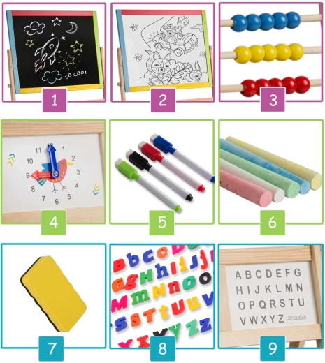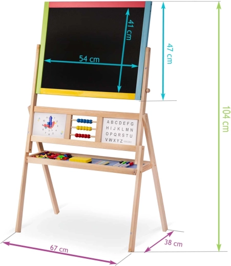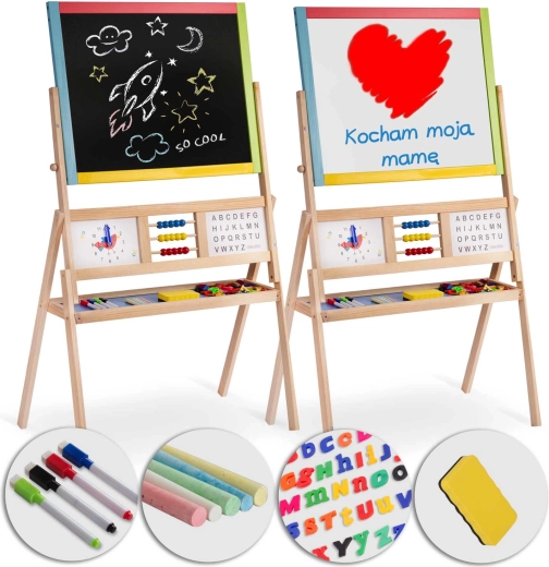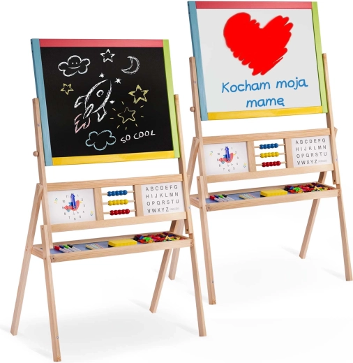 Dve tabule v jednej pre maximálnu kreativitu a rozvoj: magnetická strana umožňuje písať stierateľným fixom a pripínať magnetické písmená a číslice, kriedová strana pozýva k maľovaniu a písaniu kriedou. Otočný mechanizmus uľahčuje rýchlu zmenu plochy a plynulú hru.