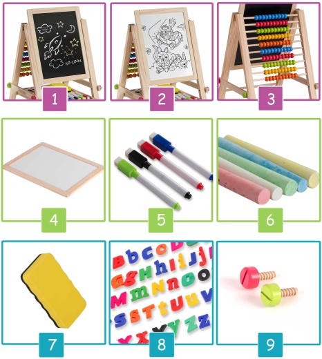 Súčasťou je praktické počítadlo na hravé precvičovanie čísel a jednoduchých príkladov, vyberateľná tabuľka na použitie mimo stojana a kompletná výbava: farebné kriedy, suchostierateľné popisovače, hubka a magnetické písmenká a číslice. Tabuľa sa rýchlo zloží bez náradia a ľahko sa prenáša.