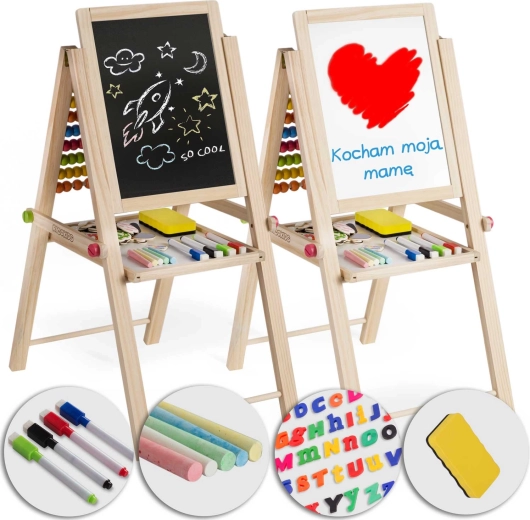 Obojstranná tabuľa ponúka klasickú kriedovú stranu na kreslenie a magnetickú suchostierateľnú stranu na písanie fixkou a prácu s magnetkami. Skvelé pre kreativitu aj nácvik písmen a čísel.