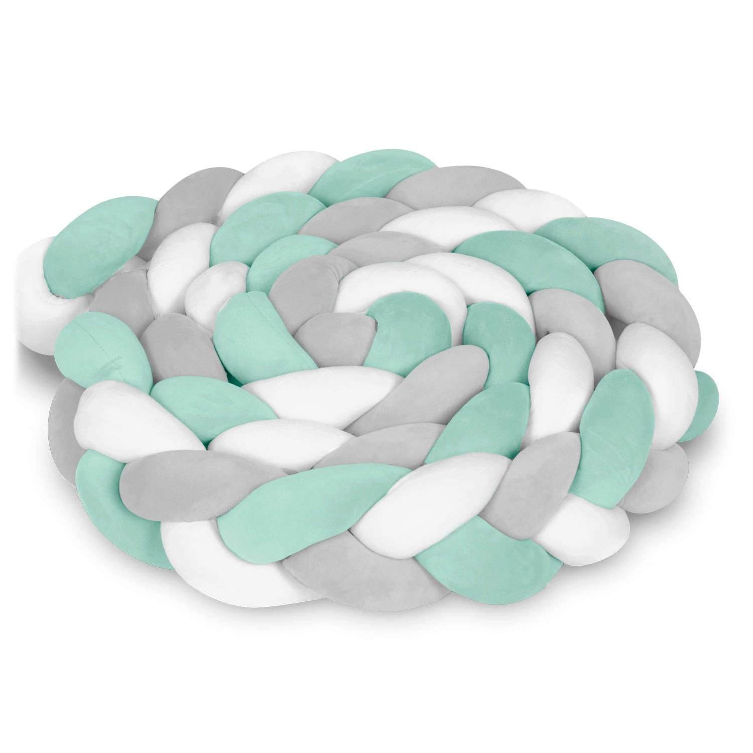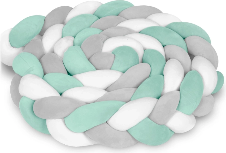 Pletený mantinel do detskej postieľky v modernej mentolovo–sivej kombinácii vytvára mäkkú, bezpečnú bariéru pozdĺž okrajov postieľky. Vďaka príjemnému, hypoalergénnemu materiálu bez ostrých prvkov je šetrný k detskej pokožke a vhodný už pre novorodencov. Husté prešívanie a nadýchaná výplň tlmia nárazy a vyplňujú medzery medzi priečkami.
