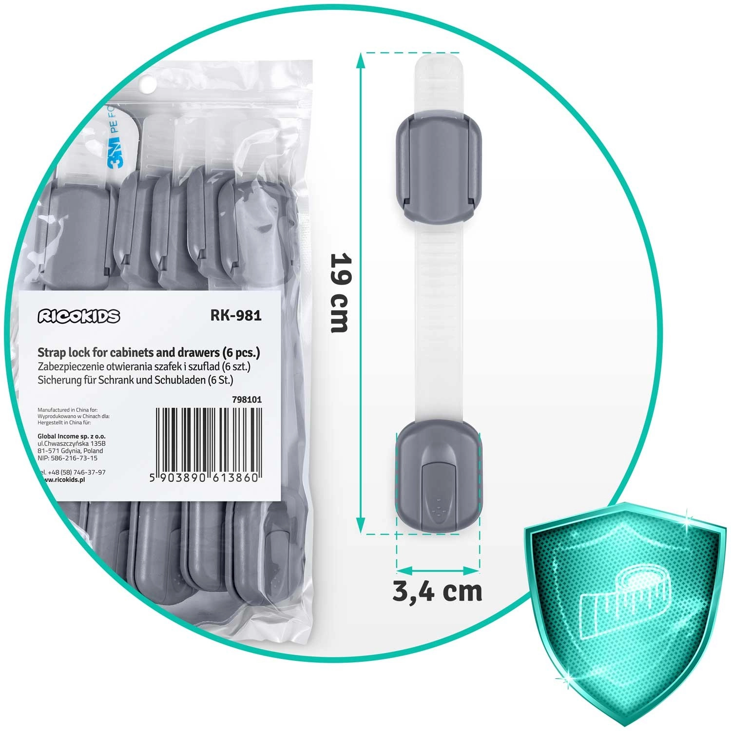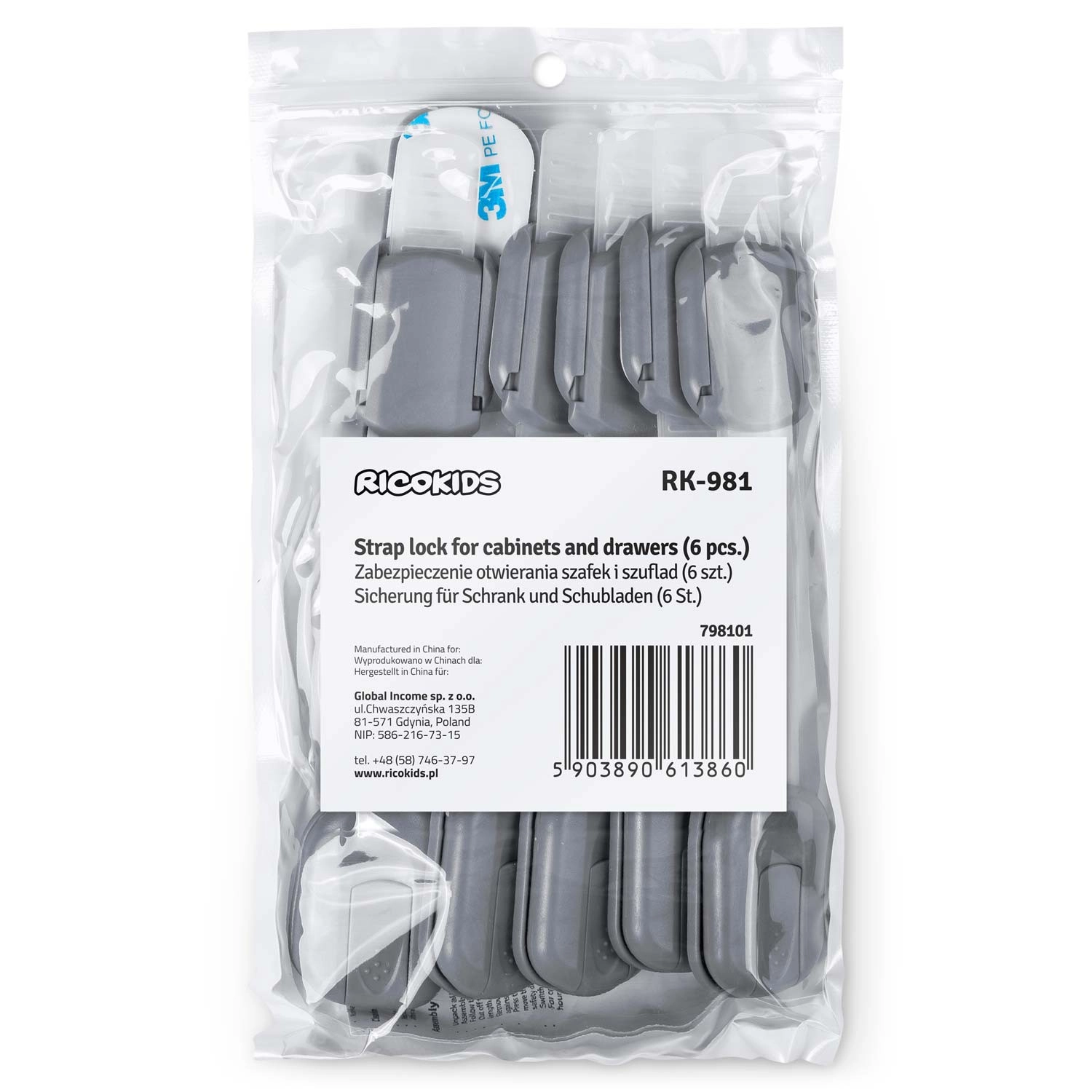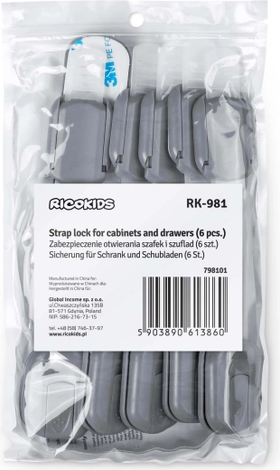 Praktické a estetické riešenie pre každú domácnosť s deťmi. Bezpečnostné poistky RICOKIDS majú flexibilný nastaviteľný pásik pre perfektné prispôsobenie rôznym povrchom a rozmerom. Inštalácia je rýchla a bez nástrojov – stačí odmastiť povrch, sňať fóliu a pritlačiť.