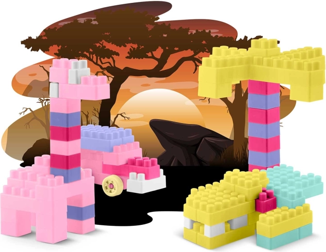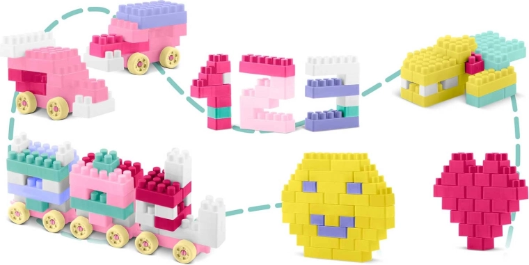 Veľká sada stavebných kociek pre deti prináša nekonečné možnosti tvorenia – od vozíkov a vláčikov po čísla, písmená, srdiečka či smajlíkov. Pastelové farby, príjemné tvary a zaoblené hrany zaisťujú bezpečnú a pútavú hru, ktorá rozvíja predstavivosť a trpezlivosť.