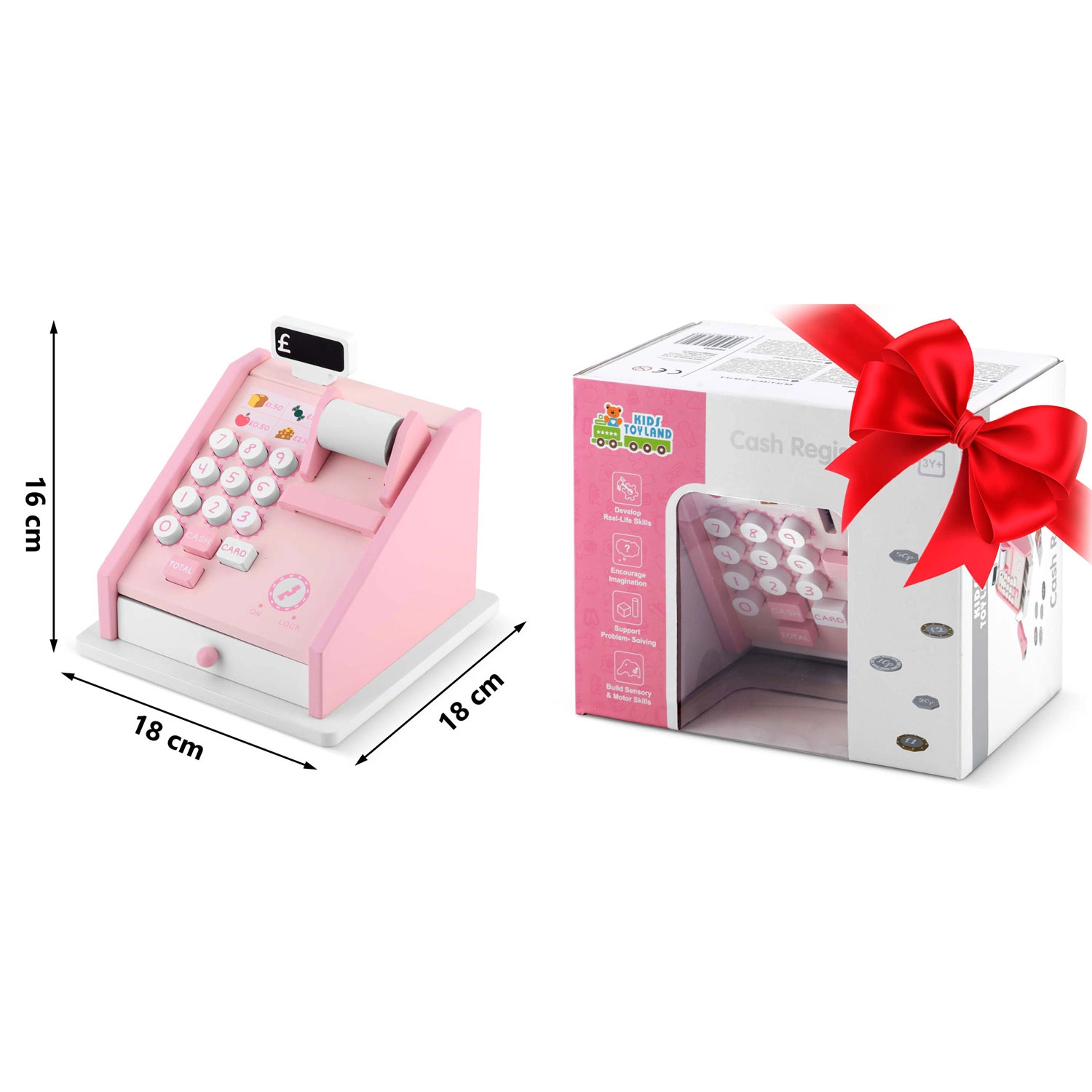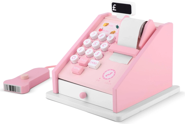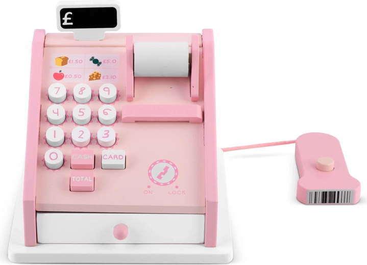 Štýlová drevená pokladňa pre malých predavačov prináša realistickú hru na obchod s funkčnou otváracou zásuvkou, rolkou účteniek, čítačkou kariet a skenerom čiarových kódov. Súčasťou je platobná karta, bankovky a mince na učenie počítania. Vyrobené z kvalitného prírodného dreva s bezpečnými farbami a sýtymi odtieňmi, ktoré rozvíjajú zrak a detskú predstavivosť.