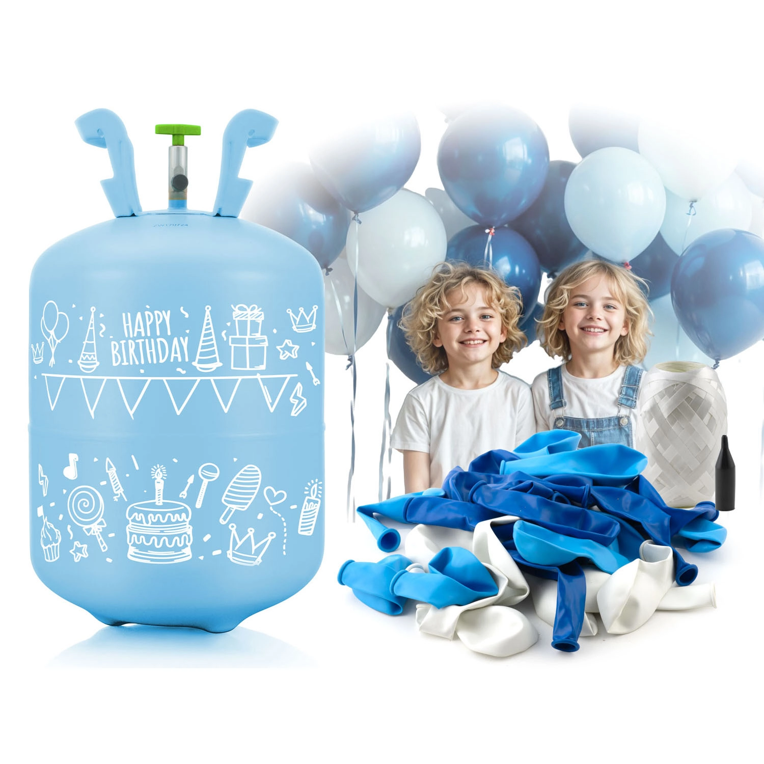- Héliová fľaša 0,20 m³, 30× balóniky (biela, svetlomodrá, tmavomodrá), 40 m dekoračnej stuhy, farebné darčekové balenie, návod a varovania (PL)