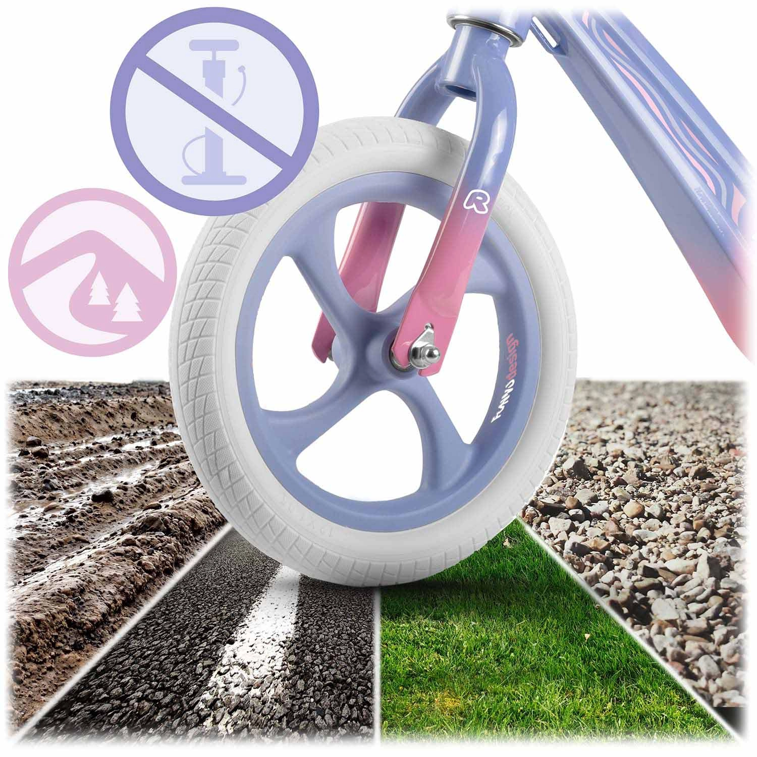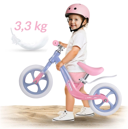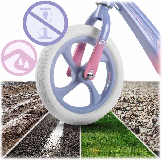 Pre bezpečnejšiu a istejšiu jazdu sú k dispozícii široké riadidlá s protišmykovými gripmi a koncovými stopermi, ktoré chránia ruky dieťaťa. Veľké 12" kolesá zabezpečujú plynulú a tichú jazdu doma aj vonku – na tráve, asfalte aj spevnených cestách. Vďaka kompaktnej konštrukcii je odrážadlo ľahko prenosné a ideálne na každodenné používanie.