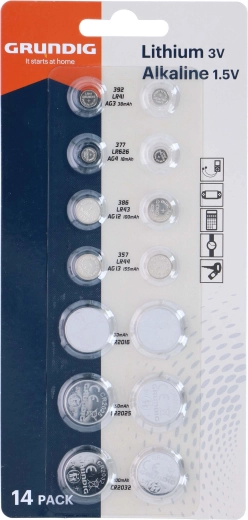Univerzálna sada gombíkových batérií GRUNDIG prináša 14 kusov najpoužívanejších typov AG a CR pre hodinky, kalkulačky, diaľkové ovládače, LED svietidlá a ďalšiu drobnú elektroniku. Spoľahlivý výkon, dlhá životnosť a široká kompatibilita v jednom praktickom balení.