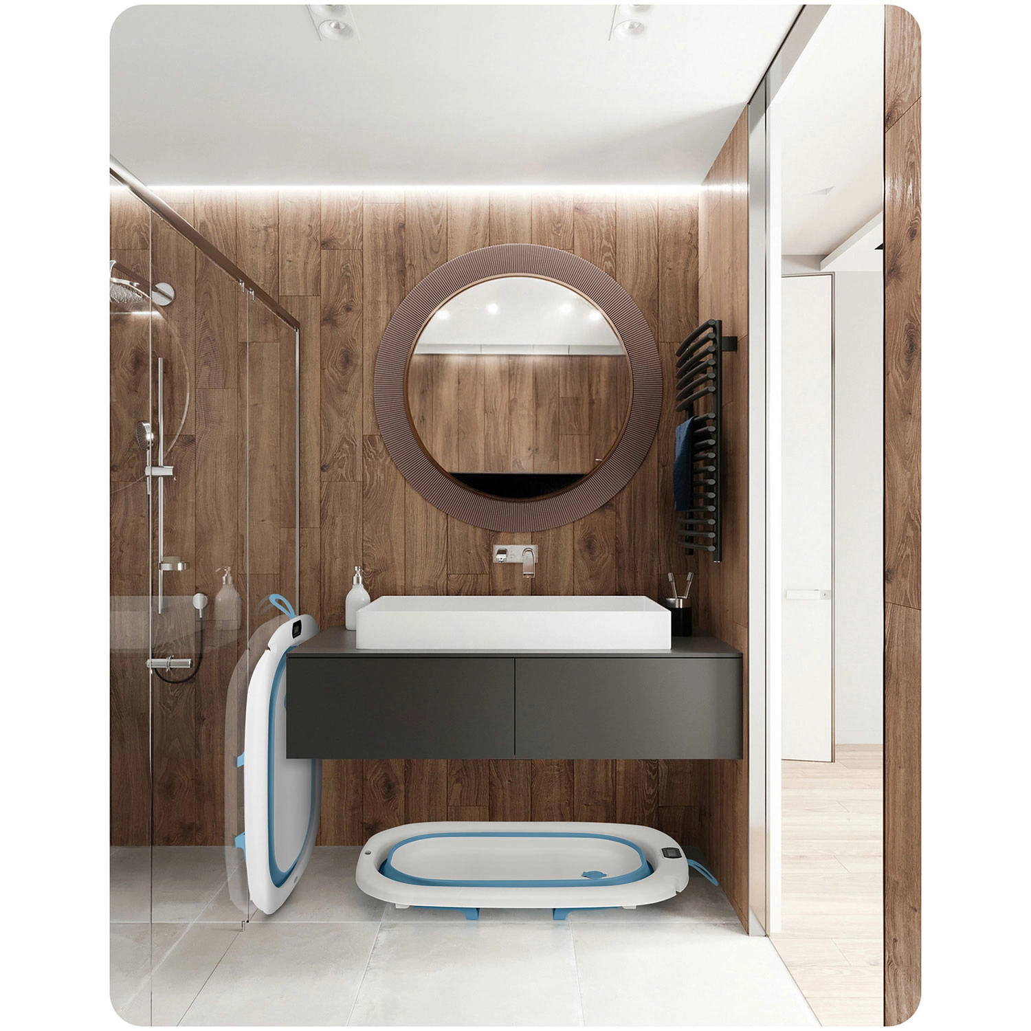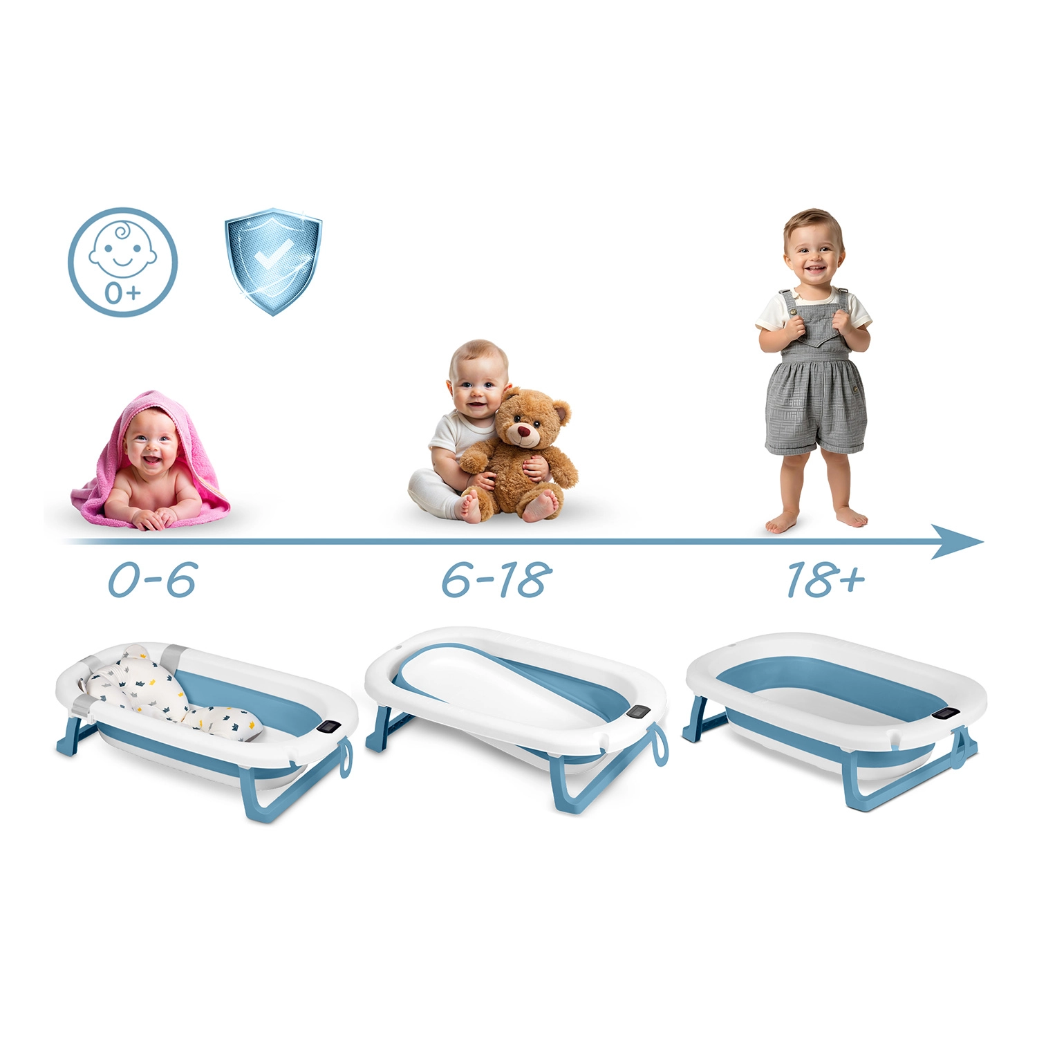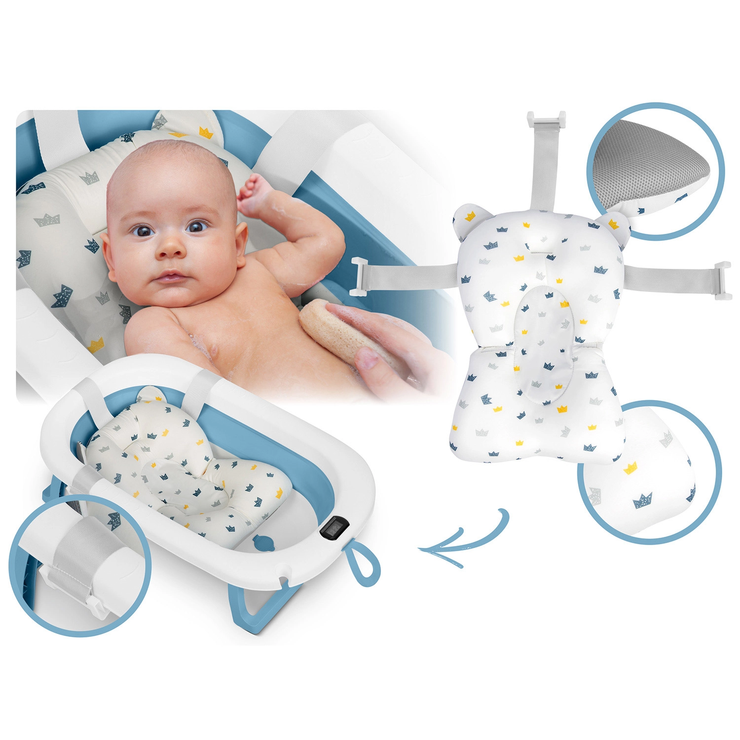 Táto skladacia detská vanička je navrhnutá pre bezpečné a pohodlné kúpanie od prvých dní. Elektronický teplomer s presnou sondou a LCD displejom pomáha strážiť ideálnu teplotu vody, zatiaľ čo zátka mení farbu, keď teplota presiahne 38 °C. Súčasťou je mäkká, priedušná a rýchloschnúca vložka s nastaviteľnými popruhmi, ktorá jemne podopiera hlavičku a chrbát bábätka.