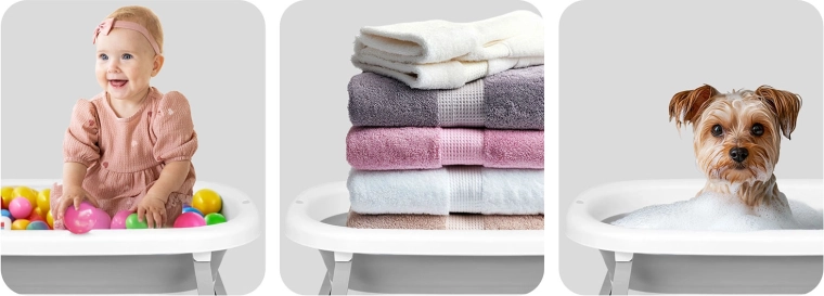 Skladacia konštrukcia s rozkladacími stabilnými nohami a protišmykovými pätkami zaručuje istotu aj na klzkej podlahe. Vďaka kompaktným rozmerom po zložení vaničku ľahko uložíte či vezmete na cesty. Praktický držiak na sprchovú ružicu uľahčí napúšťanie bez špliechania a dno s výpusťou urýchli vyprázdňovanie.