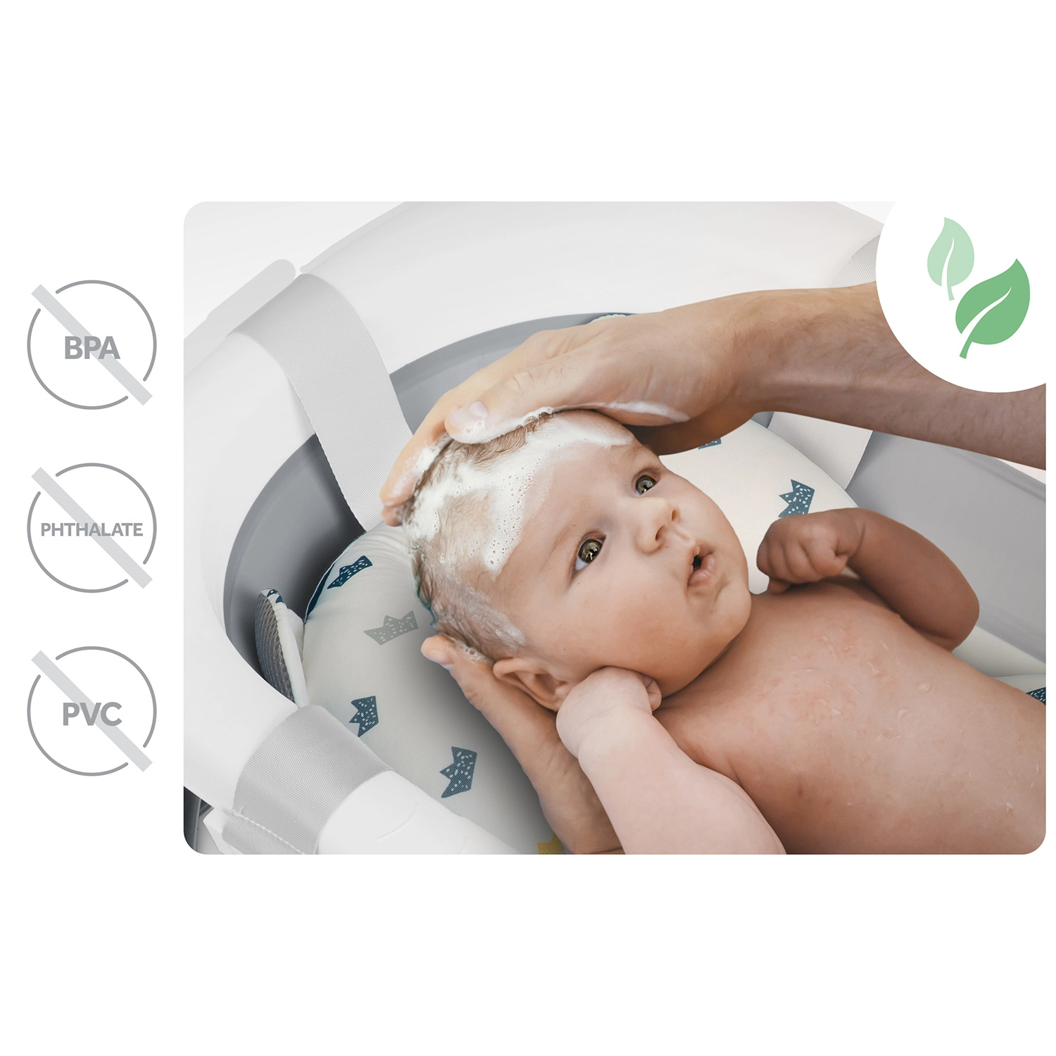 Polstrovaná, rýchloschnúca vložka s nastaviteľnými popruhmi bezpečne drží na okrajoch vaničky. Podopiera hlavičku a chrbátik a zvyšuje komfort aj bezpečie.