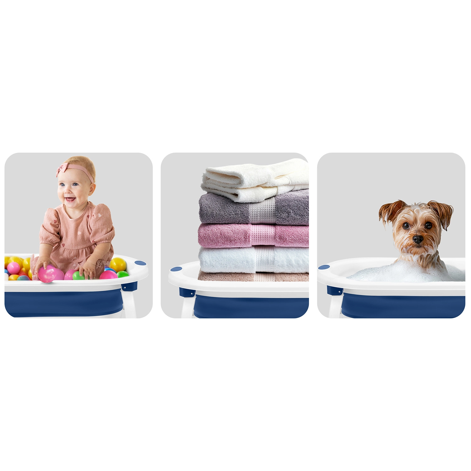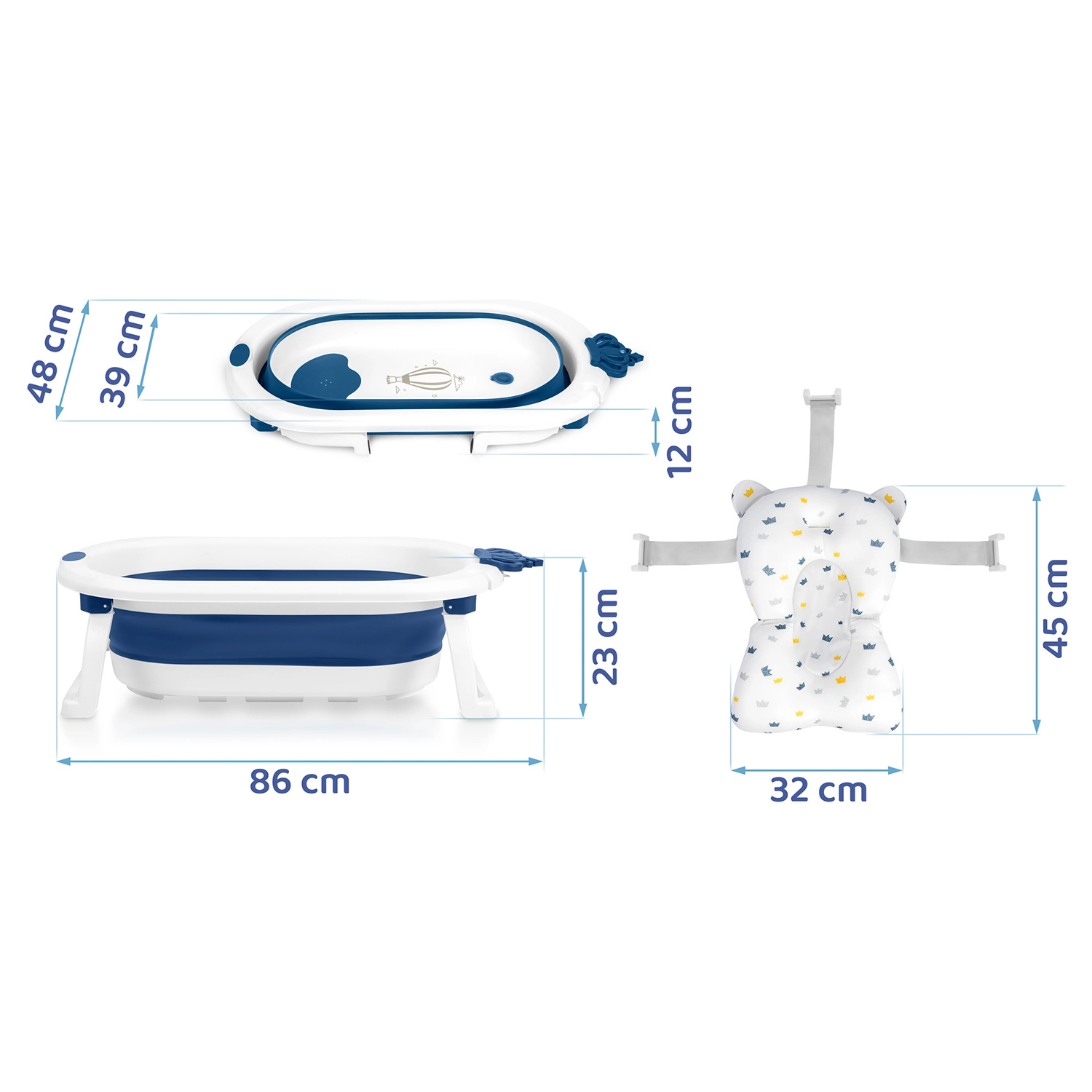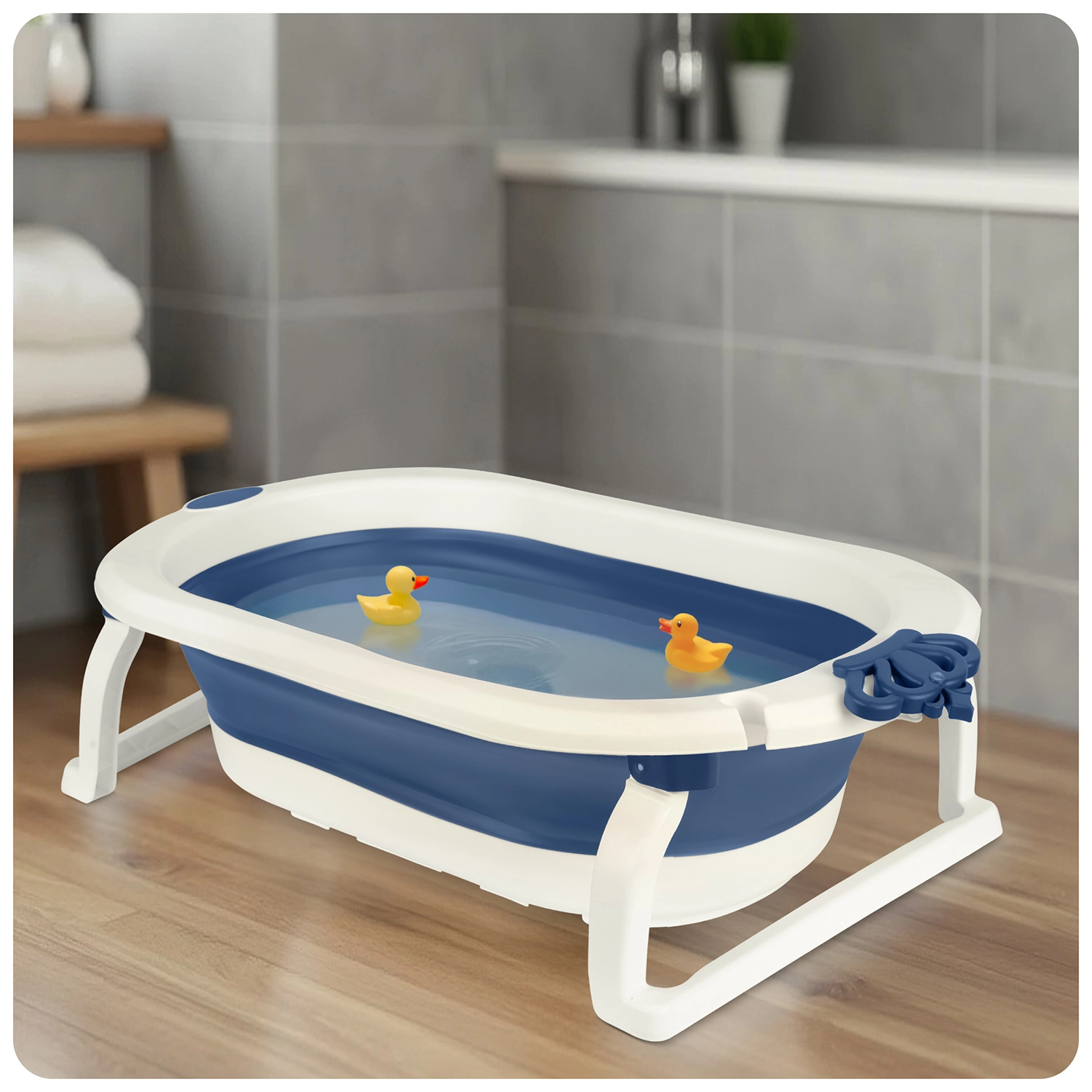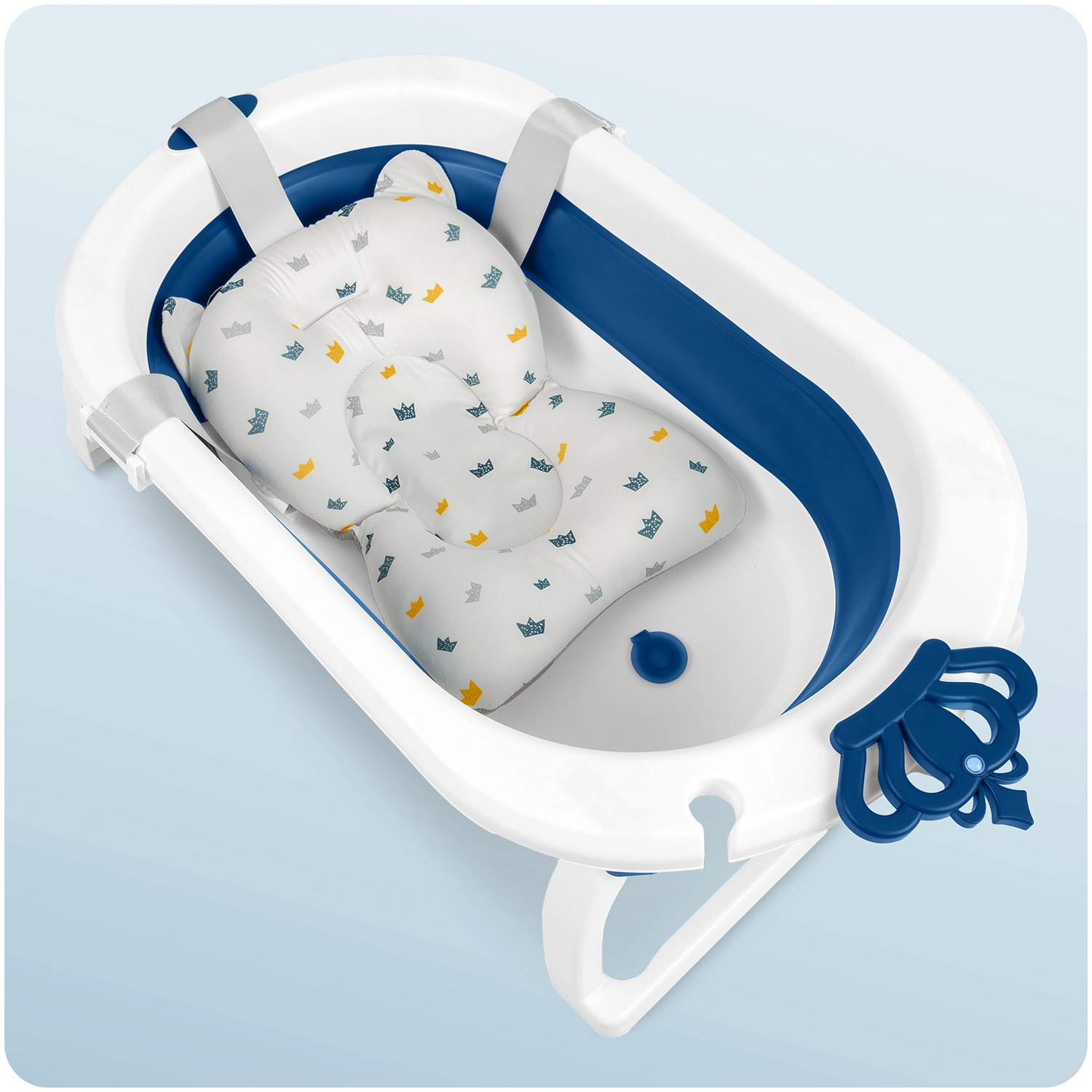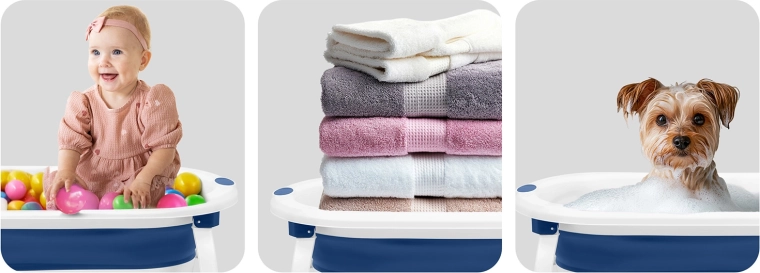 Táto skladacia vanička rastie s vaším dieťaťom: od bezpečnej podpory novorodencov na mäkkej vložke, cez samostatné sedenie batoliat, až po priestranné kúpanie predškolákov. Ľahká konštrukcia, rýchle skladanie a protišmykové nožičky zabezpečujú komfort aj istotu pri každodennej kúpeli. Teplotná zátka varuje zmenou farby, len čo voda presiahne 38 °C.