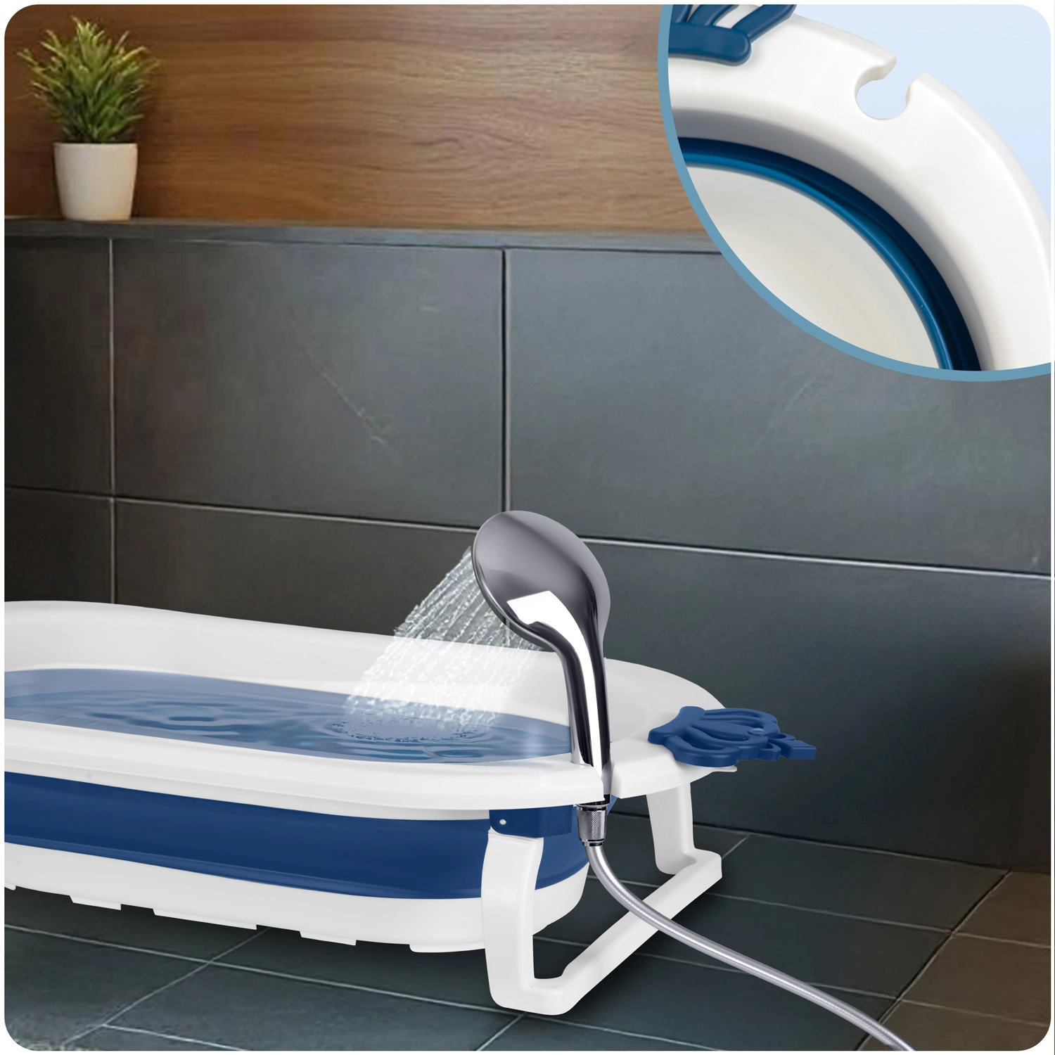 Kompaktné rozmery po zložení šetria miesto v kúpeľni aj pri cestovaní. Integrovaný držiak na sprchovú hlavicu uľahčuje napúšťanie vody bez rozstreku.