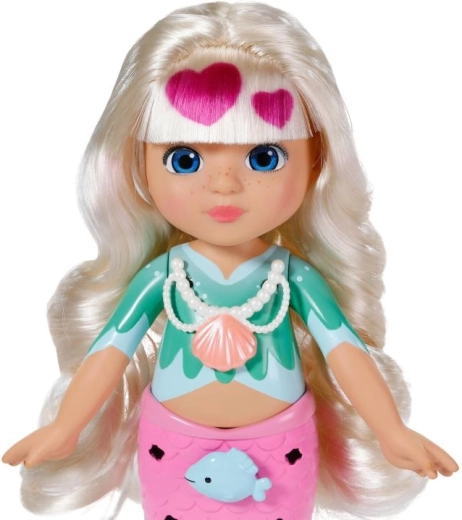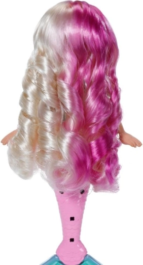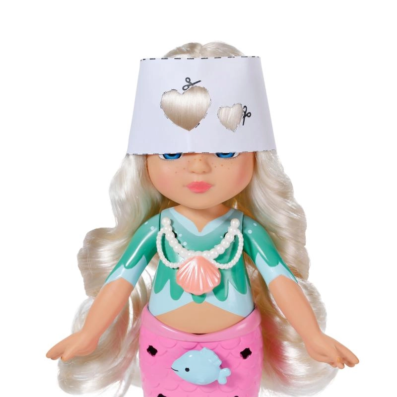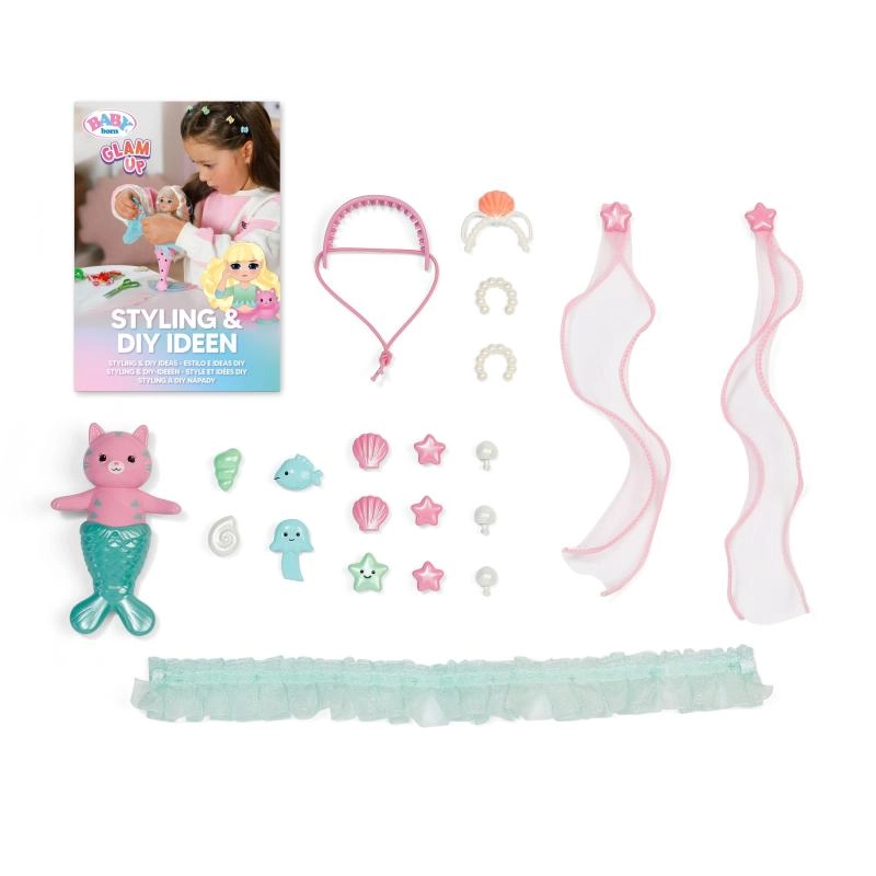 Objavte svet tvorenia s bábikou BABY born Glam Up morská víla Sparkle, ktorá miluje zmeny vzhľadu a farieb. Vďaka dlhým blond vlasom meniacim farbu na slnku, nacvakávacím ozdobám, textilným doplnkom a roztomilému zvieraciemu kamarátovi deti ľahko vytvoria originálne štýly od hlavy až po plutvu. Perfektné na kreatívne česanie, zdobenie a fantazijné hranie.