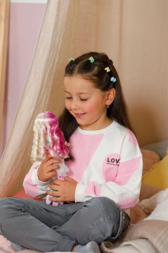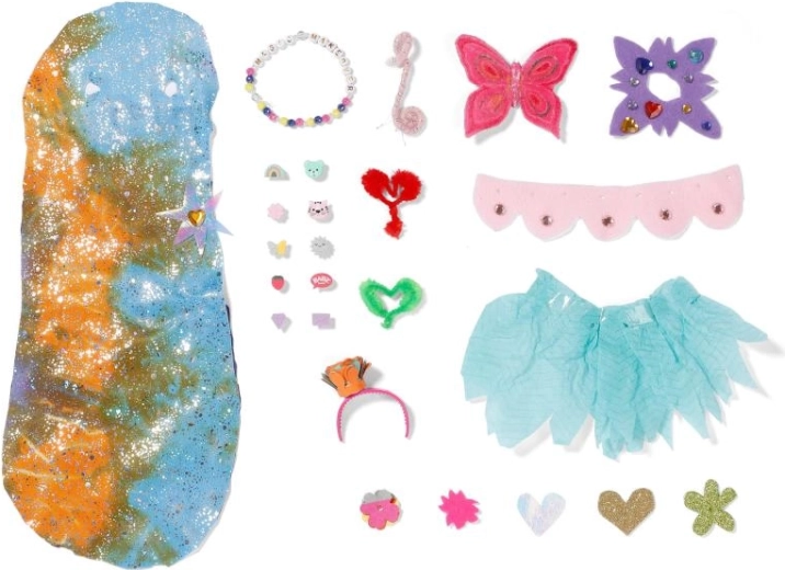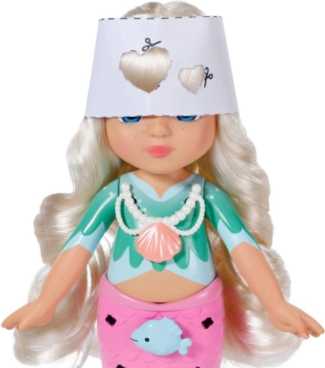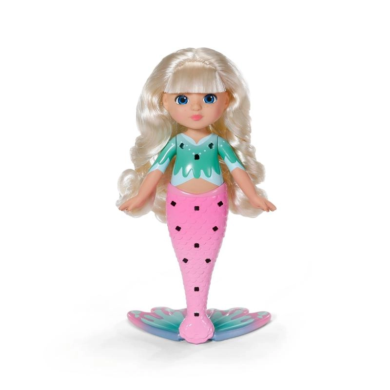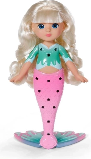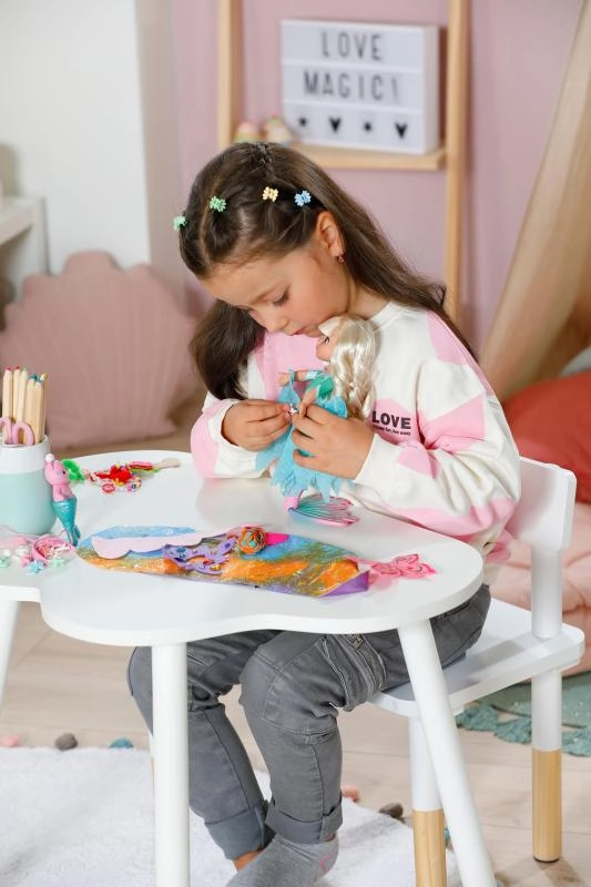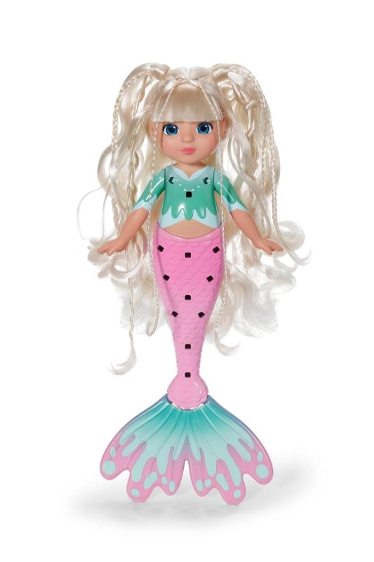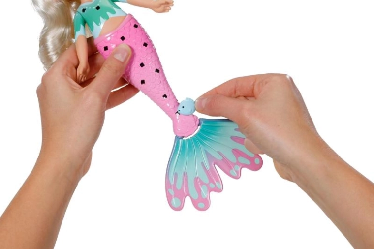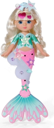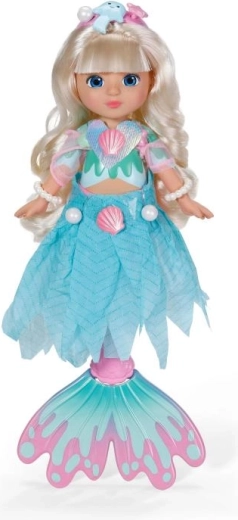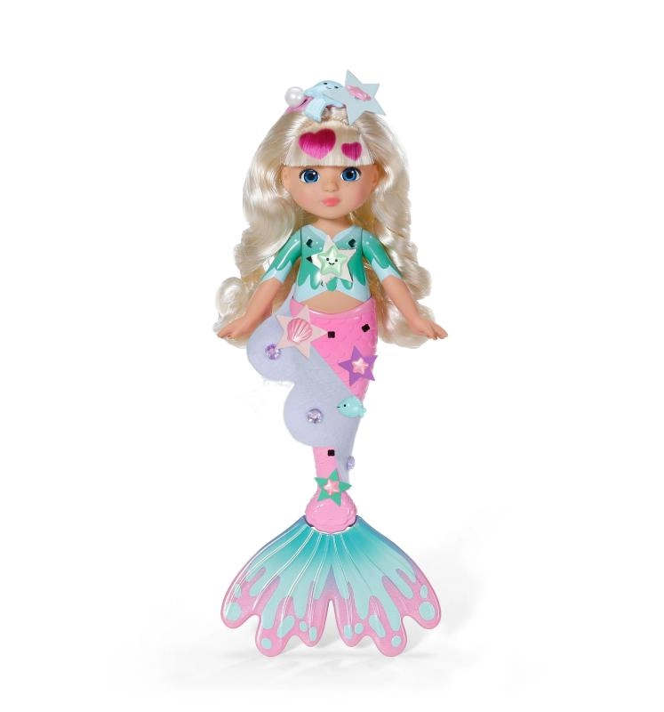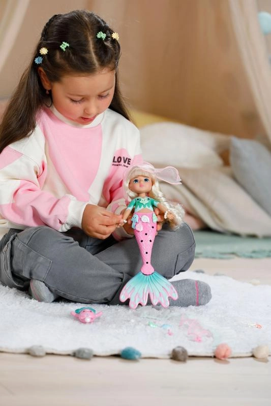 Súčasťou sú textilné doplnky, farebné nacvakávacie ozdoby, inšpiratívna brožúrka a roztomilé zvieratko s odnímateľnou plutvou. Kombinujte, pripínajte, zdobte a stylujte – vždy inak a originálne. Bábika je ideálna na rozvoj jemnej motoriky, kreativity a rozprávania vlastných podmorských príbehov.
