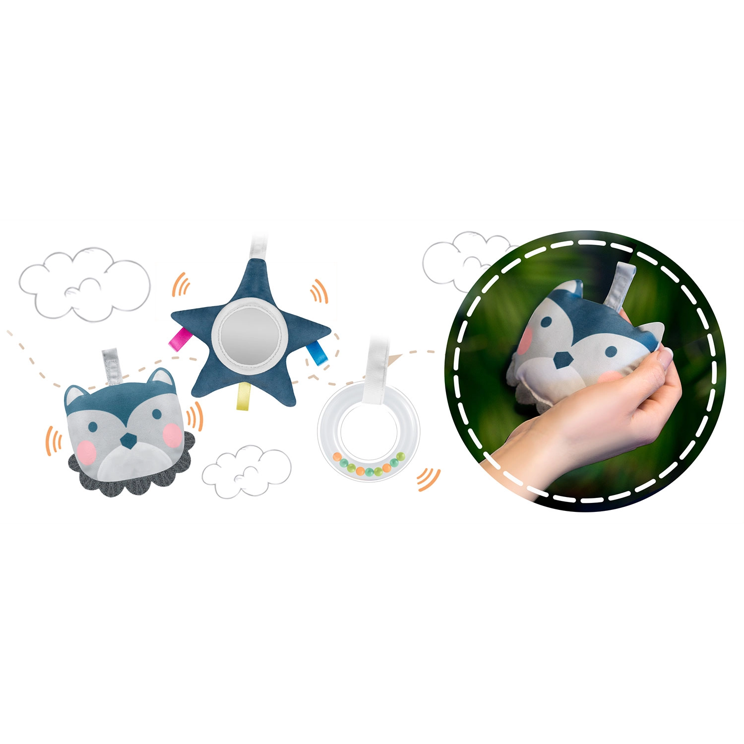 Odnímateľná hrazdička so šuštiacimi hračkami, krúžkom a bezpečným zrkadielkom podporuje zrak, hmat aj koordináciu. Hračky možno ľahko preusporiadať či vymeniť.