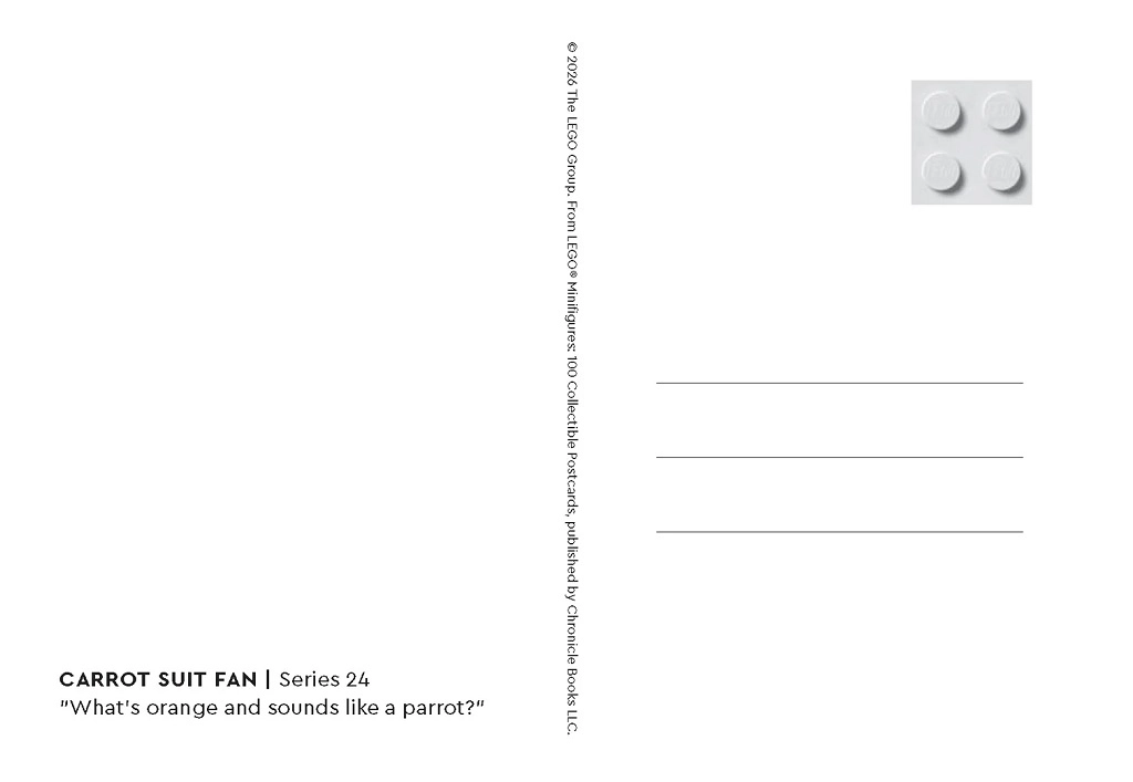 Na zadnej strane každej pohľadnice nájdete doplňujúce informácie – názov minifigúrky, sériu a tiež oficiálny slogan plný typického LEGO humoru. Sadu môžete využiť na odosielanie pozdravov, ako originálnu nástennú dekoráciu alebo na vytvorenie vlastnej domácej LEGO galérie.