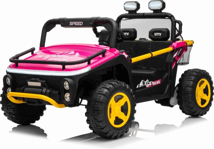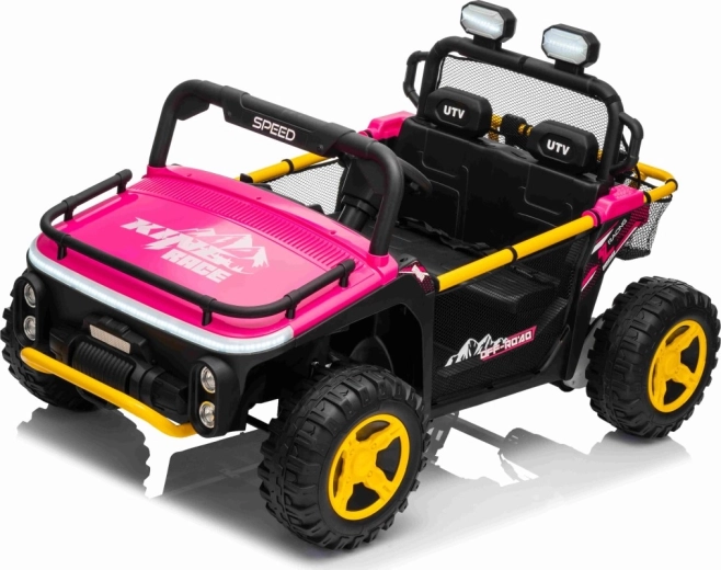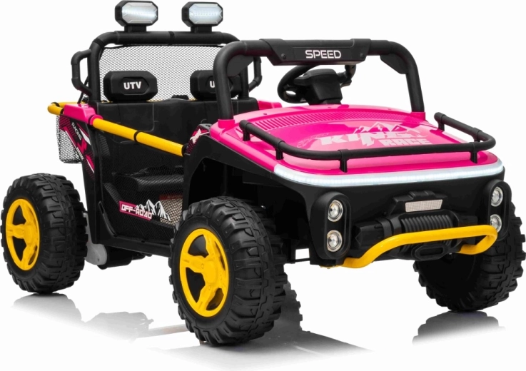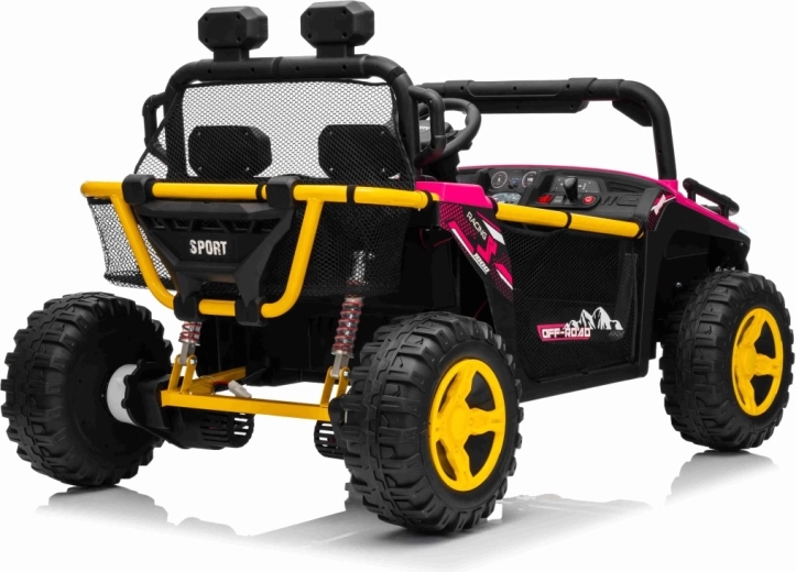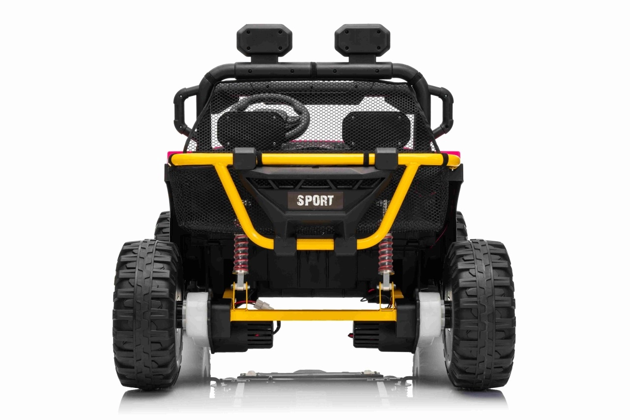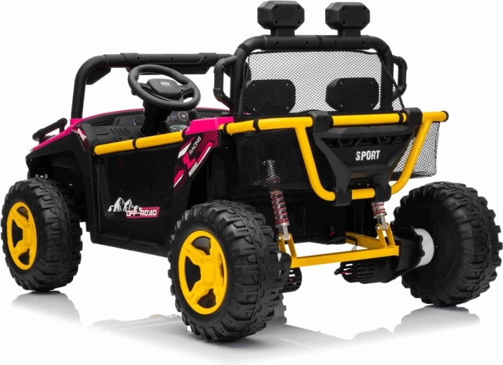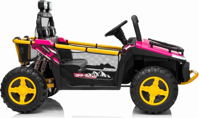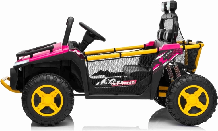 Ružové elektrické auto pre deti v štýle off‑road buggy prináša silný 24V výkon (2×80 W), pohodlnú jazdu s odpružením a bezpečné diaľkové ovládanie 2,4 GHz s funkciou Stop. Veľké EVA kolesá 30×12 cm, LED svetlá vpredu aj na hornom oblúku a audio panel s MP3/USB/Bluetooth zaistia zábavu na každej vychádzke. Dve samostatné sedadlá s pásmi a nosnosť až 40 kg robia z tohto UTV ideálnu voľbu pre súrodencov.