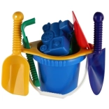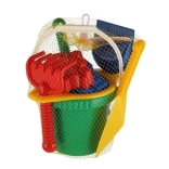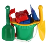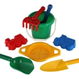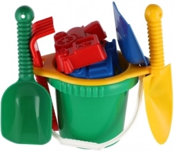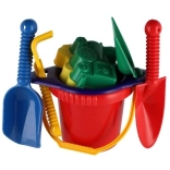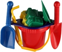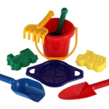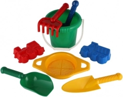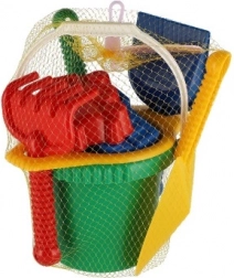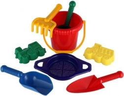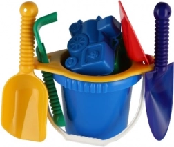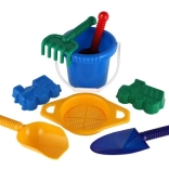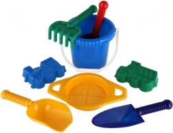 Obsahuje všetky potrebné nástroje pre stavbu a kreatívnu hru na piesku - vedierko, sito, lopatky, hrabličky a dve bábovky.