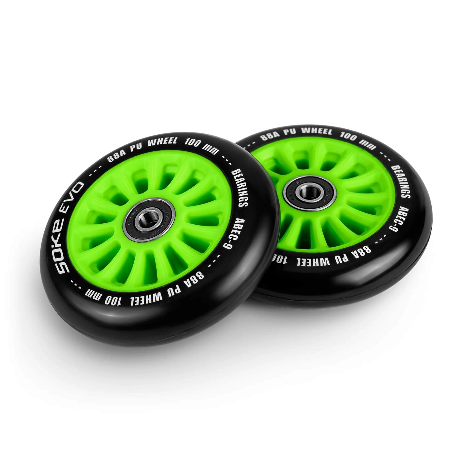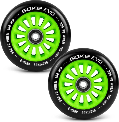 Vizuálne výrazný zelený stred kolieska dodá vašej kolobežke športový vzhľad a zároveň podčiarkne kvalitné prevedenie. Štandardný priemer 100 mm a osička 8 mm zabezpečujú širokú kompatibilitu s mnohými modelmi freestyle aj mestských kolobežiek.