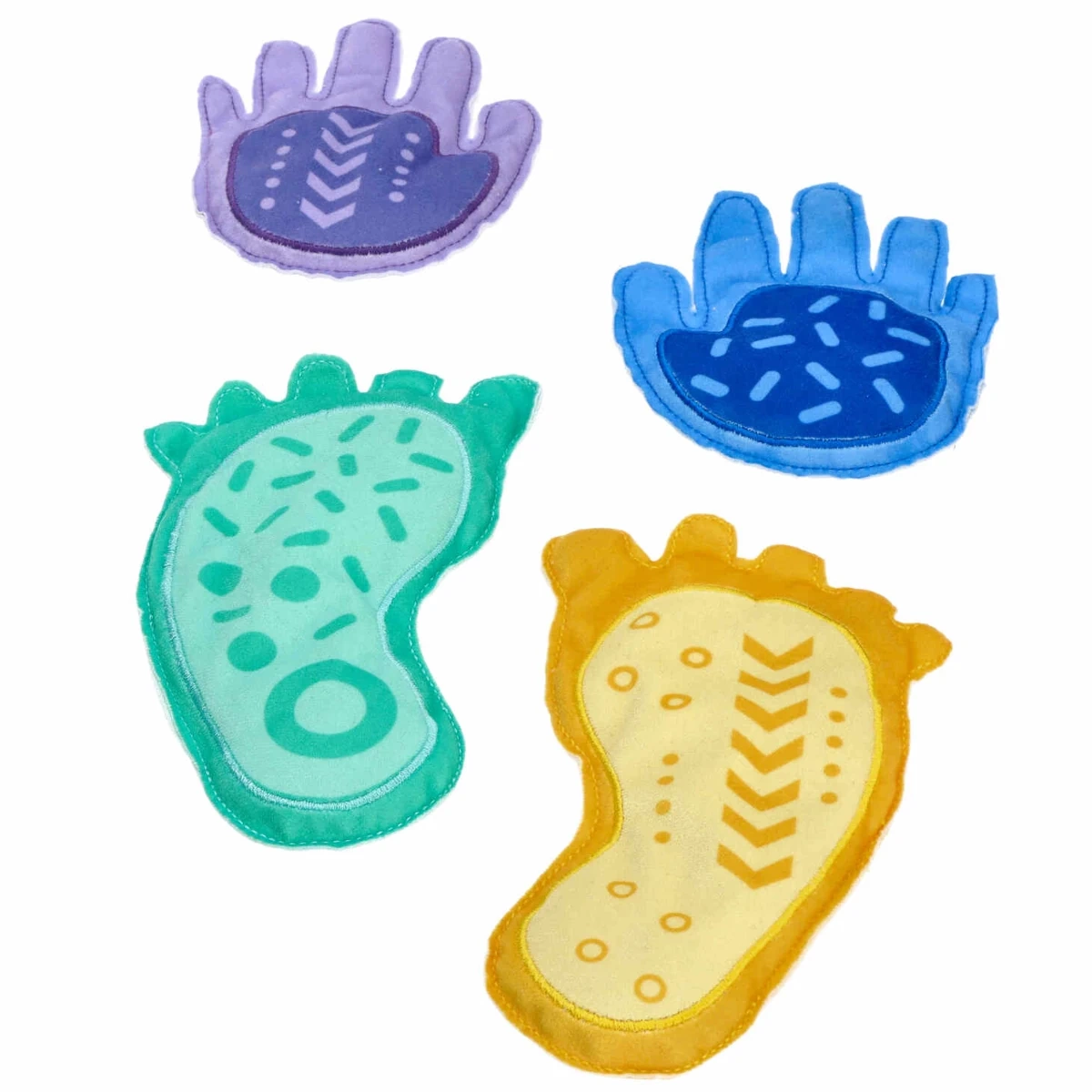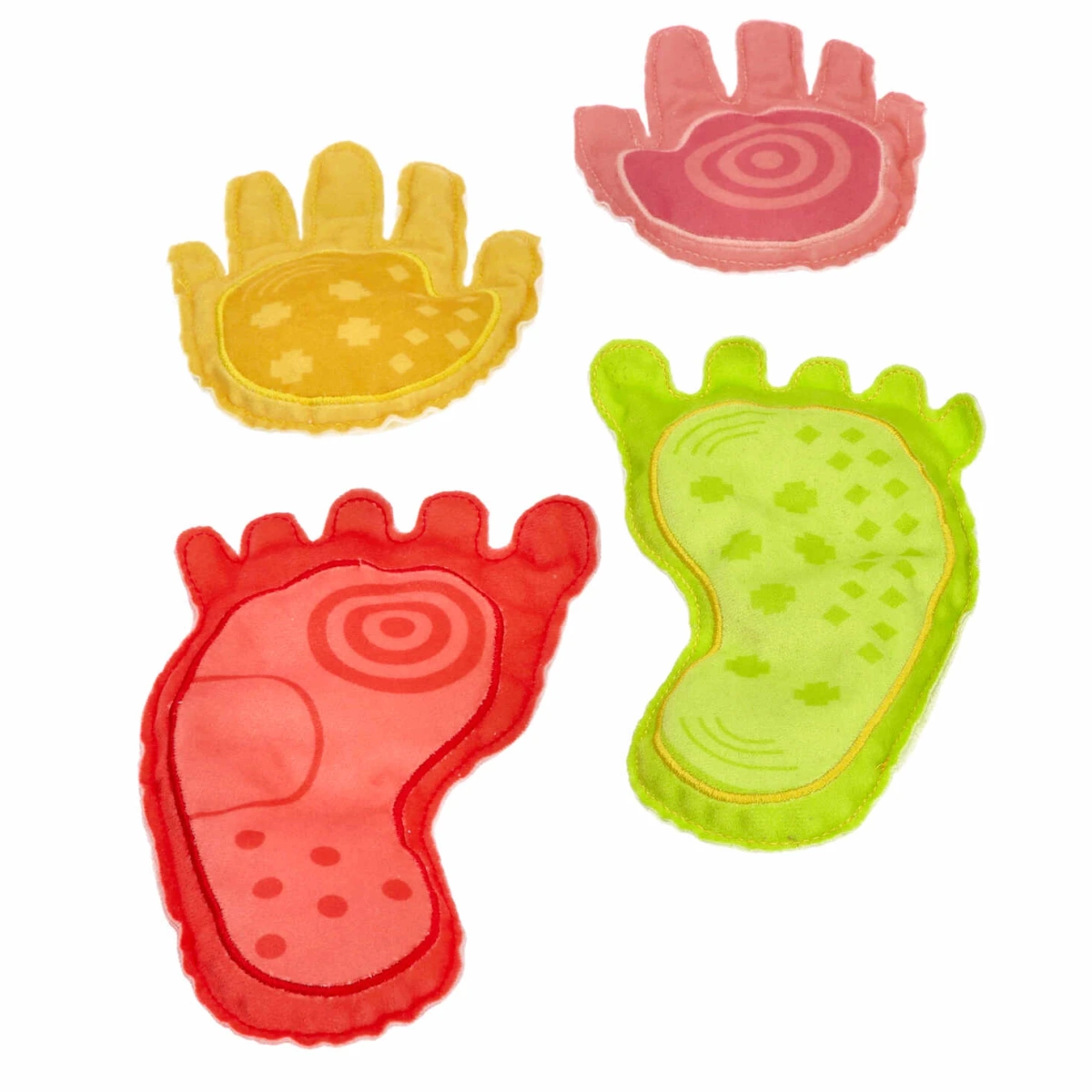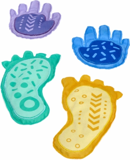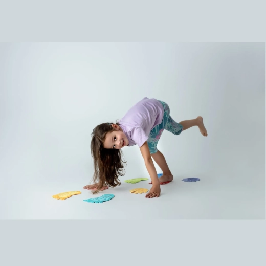 Farebné ruky a nohy vedú kroky, učia presnému došľapu, posilňujú stabilitu tela a koordináciu ruka–oko počas hier a cvičení.