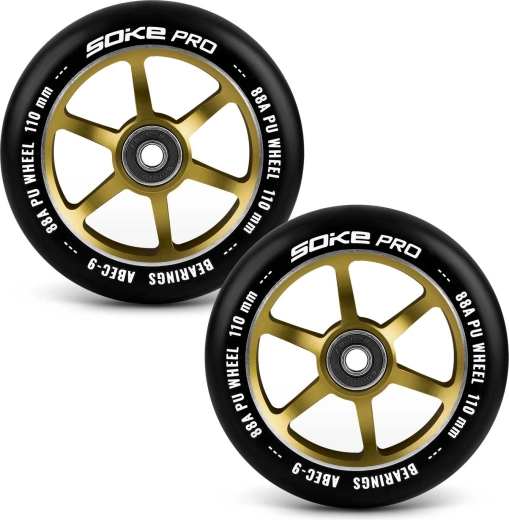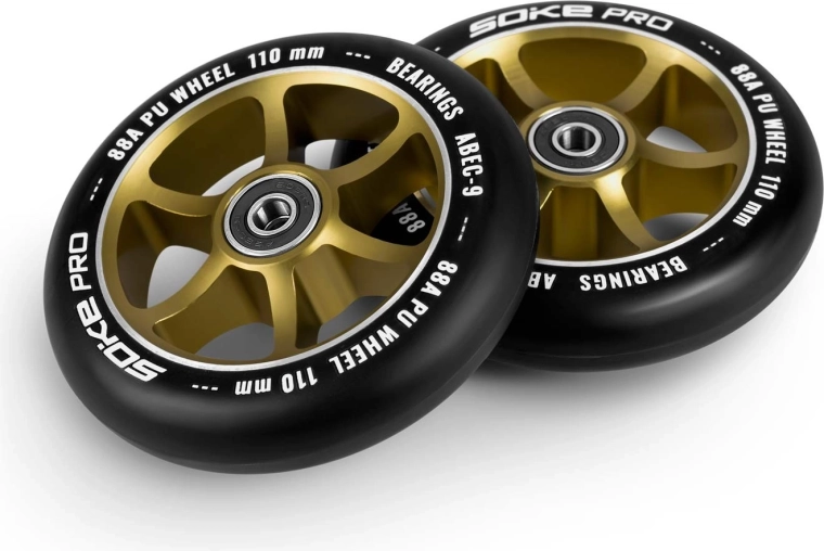 Set dvoch koliesok SOKE 110 mm prináša spoľahlivý výkon pre každodenné jazdenie aj triky. Polyuretán 88A poskytuje skvelý kompromis medzi priľnavosťou a rýchlosťou, zatiaľ čo ložiská ABEC-9 sa postarajú o mimoriadne hladký chod. Hliníkové jadro v zlatej farbe zvyšuje tuhosť a odolnosť pri dopadoch a náročných manévroch.
