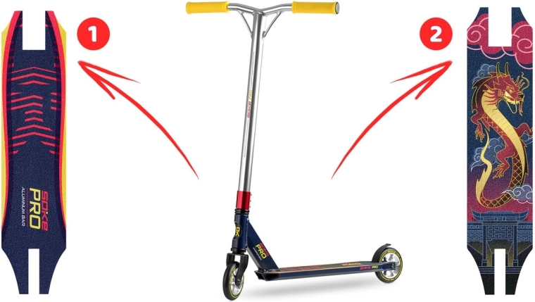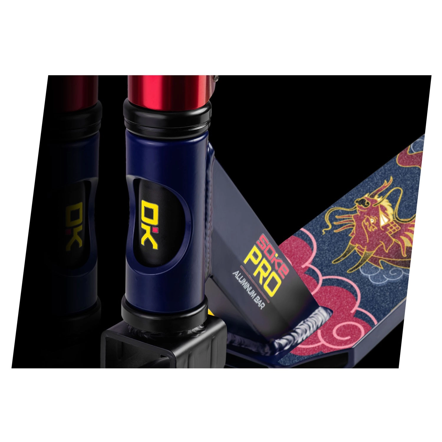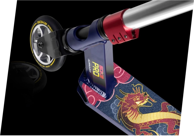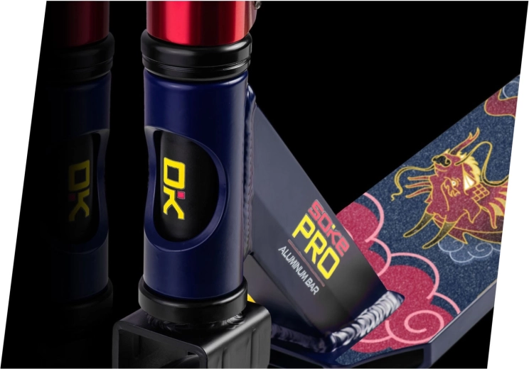 Model SOKE PRO v granátovo‑červenom prevedení je navrhnutý pre progresívnu jazdu a triky. Zosilnené Y‑BAR riadidlá z tepelne spracovaného hliníka zaisťujú vysokú odolnosť, zatiaľ čo kompresný systém HIC s hliníkovou triple objímkou drží všetko pevne na mieste. Široké TPR gripy 145 mm poskytujú istý úchop a pohodlie aj pri dlhších session.