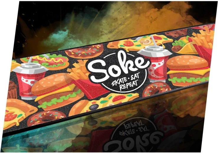 Vylepšite kontrolu nad svojou kolobežkou s grip tapom SOKE Go! – Fast Food. Hrubšia zrnitosť ponúka pevný a stabilný kontakt medzi topánkou a doskou, takže sa môžete naplno sústrediť na učenie nových trikov aj na pokročilé kombinácie. Štýlová potlač dodá vašej doske originálny vzhľad a odlíši vás v parku aj na ulici.