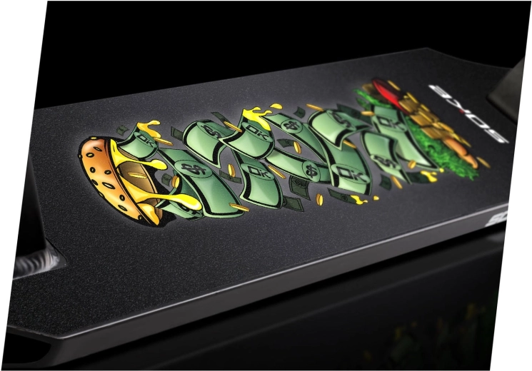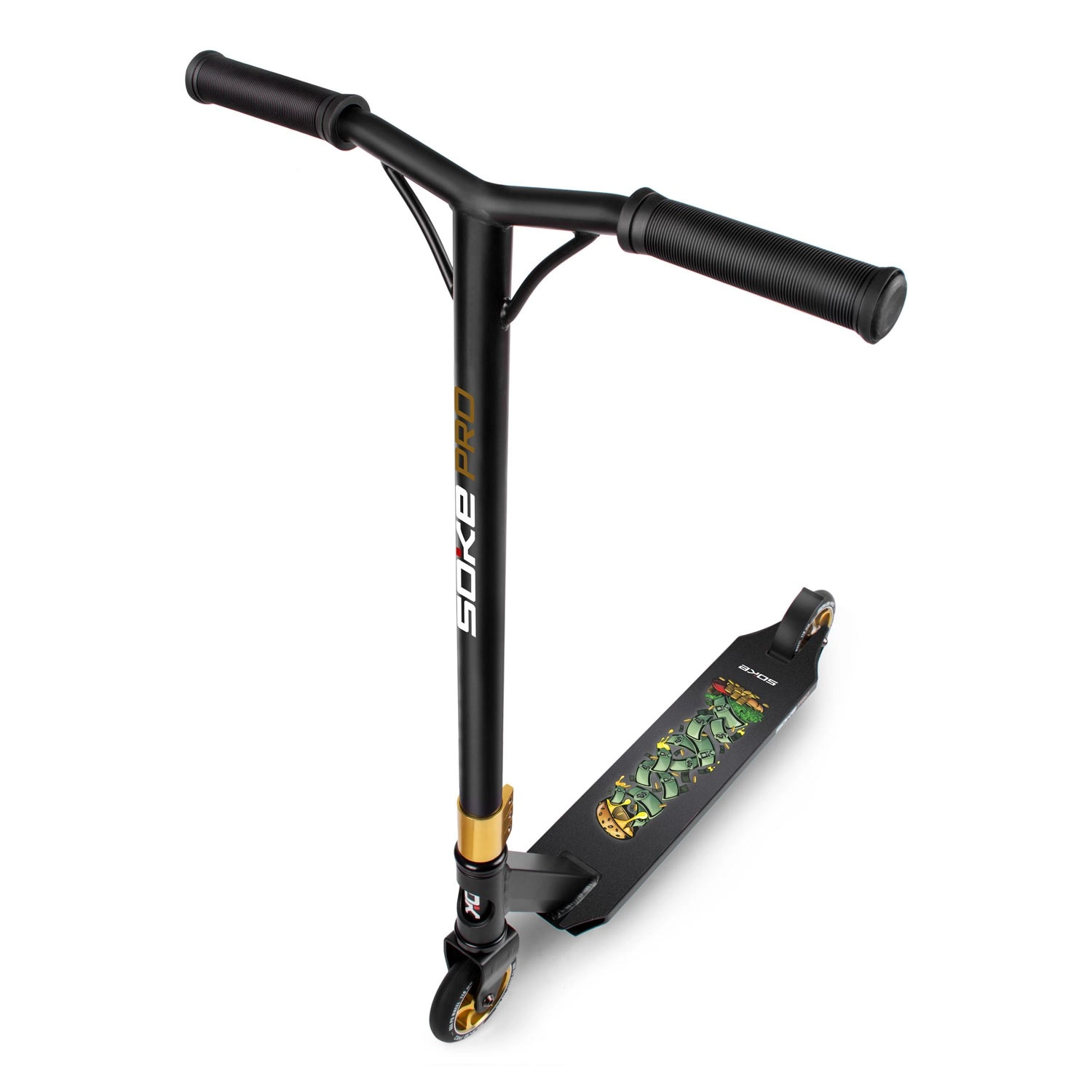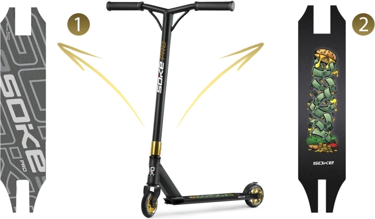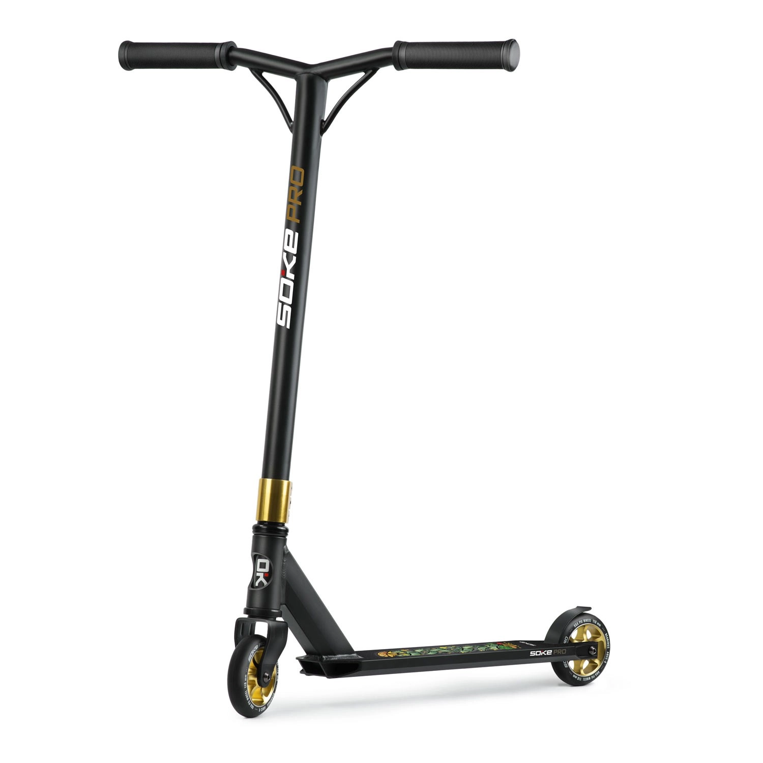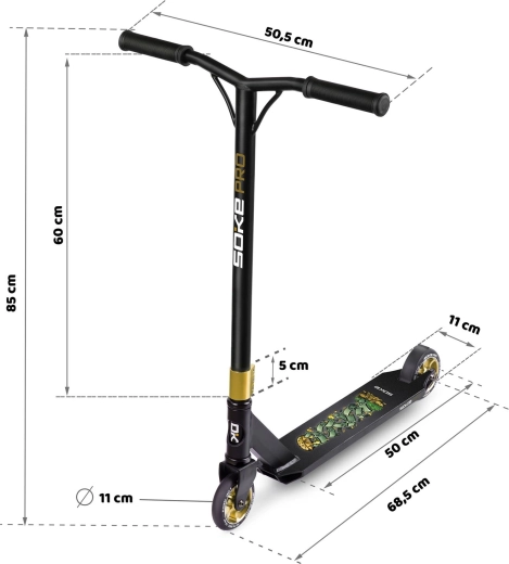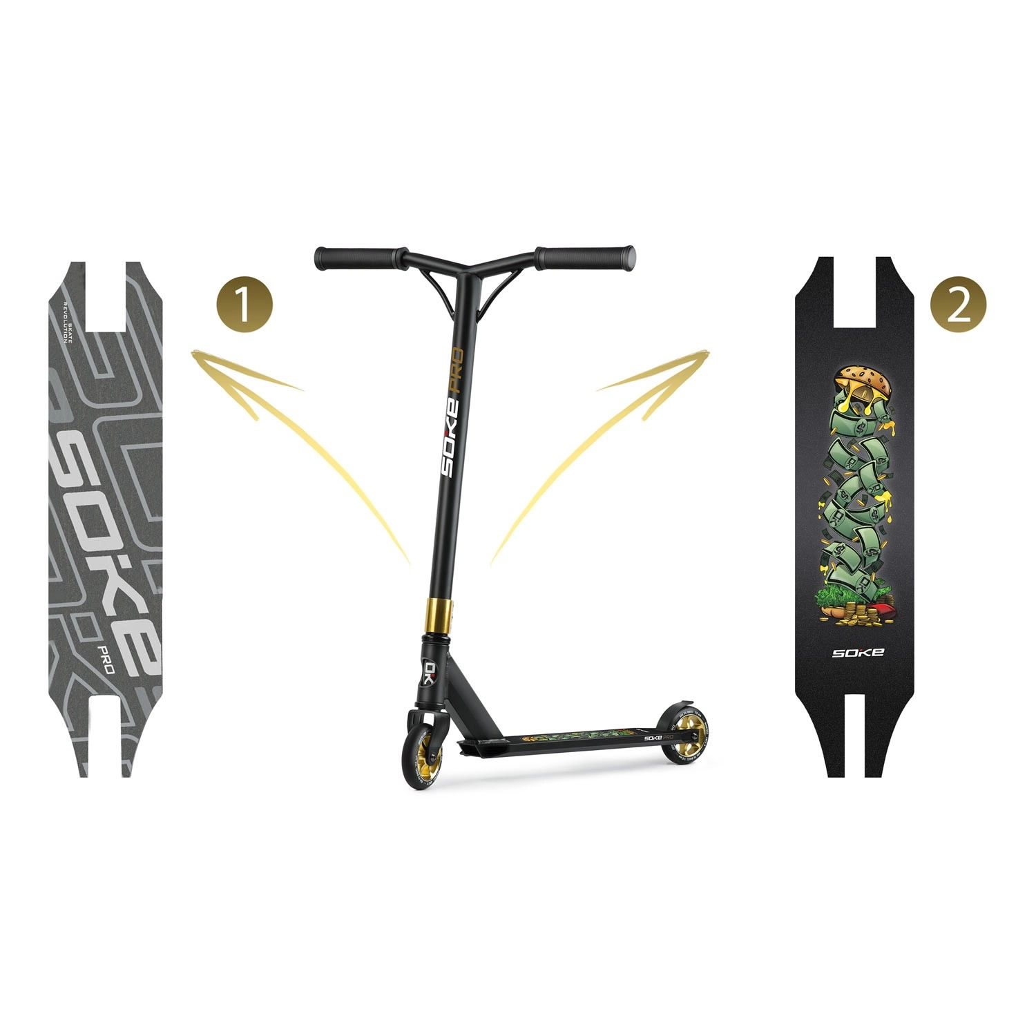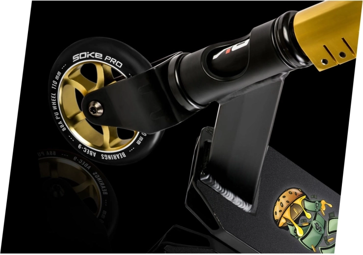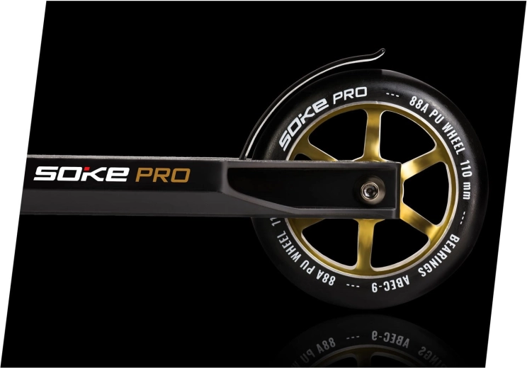 Hľadáte kolobežku, ktorá zvládne intenzívny tréning aj náročné triky? Soke Pro Gold kombinuje skvelý pomer ceny a kvality s komponentmi overenými jazdcami: ABEC-9 pre hladkú rýchlosť, 110 × 24 mm PU 88A pre ideálnu priľnavosť a pevný hliníkový deck s peg‑cut tvarom pre grindy a whipy. Stabilné Y/T riadidlá 50,5 cm so 145 mm TPR gripmi zaistia pohodlie aj kontrolu.