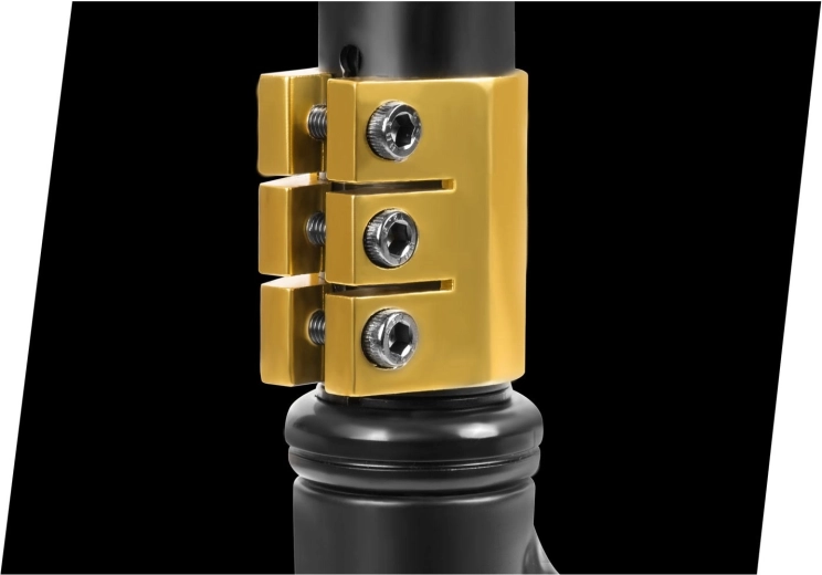 HIC systém s hliníkovým triple clampom a zosilnenými skrutkami drží všetko pevne pokope pre presné riadenie a istotu pri dopadoch.