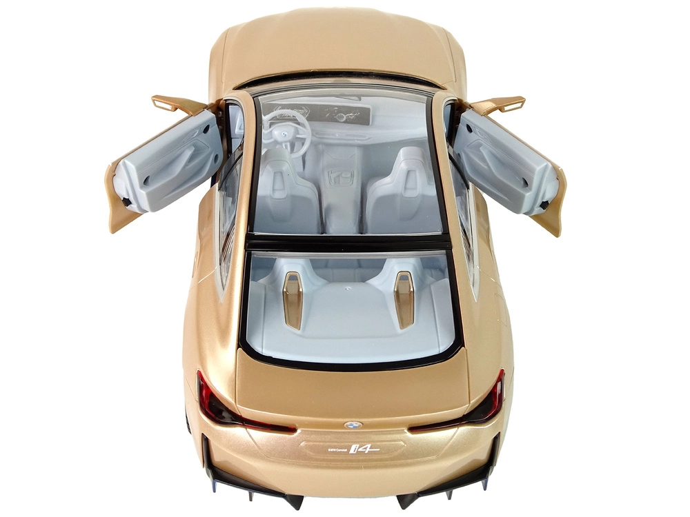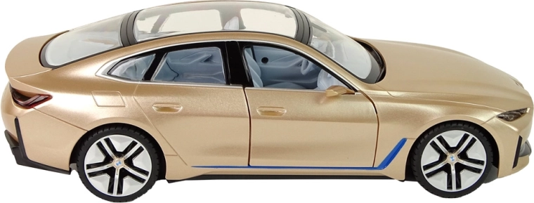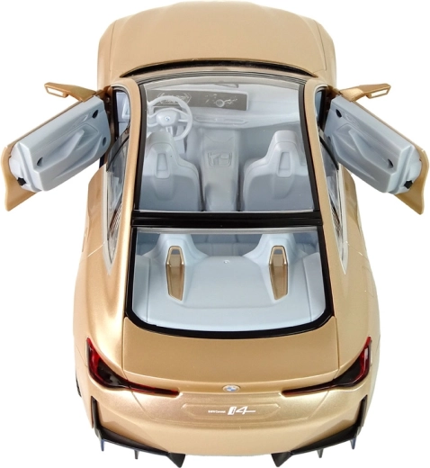 Detailná karoséria BMW i4 s panoramatickou strechou, precíznymi líniami a lesklým zlatým lakom v mierke 1:14 vyzerá skvelo na trati aj vo vitríne.