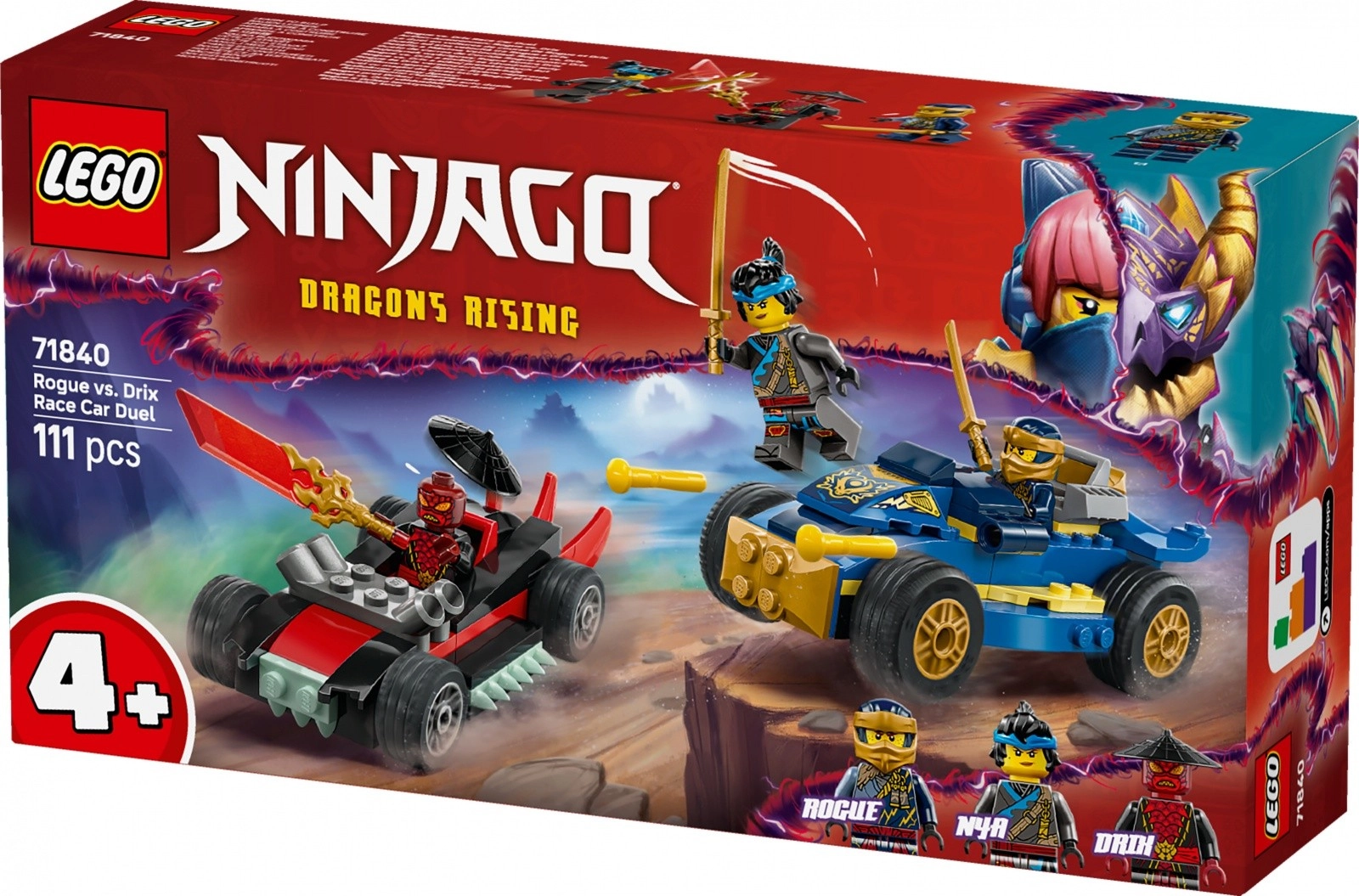 Objavte akčnú stavebnicu LEGO NINJAGO pre deti od 4 rokov – preteky Rogue vs. Drix s dvoma autami, tromi minifigúrkami a ľahkým štartovacím dielikom pre rýchle stavanie. Čakajú vás streľátka, zlaté katany a množstvo napínavých súbojov dobra so zlom.