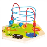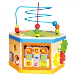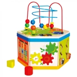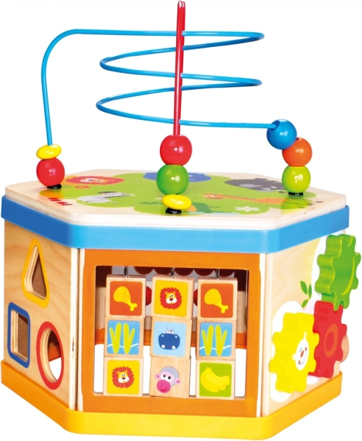 Mnohostenná motorická hračka zaujme zvedavé deti pestrými farbami a množstvom ponúkaných aktivít obohatených o didaktický rozmer. Možno viesť koráliky v bludisku, počítať guľôčky, posúvať ikonami zvieratiek, otáčať nimi a priraďovať im potravu, otáčať ozubenými kolieskami, vkladať kocky a učiť sa rozpoznávať čas. Hračka je robustná, vyrobená z hrubej preglejky. Hlavné vlastnosti: kocka s vekom a 3 dielmi vkladacej skladačky, rozvíjajte orientáciu v priestore aj čase, priraďujte tvary a farby, precvičujte jemnú motoriku, robustné drevené prevedenie