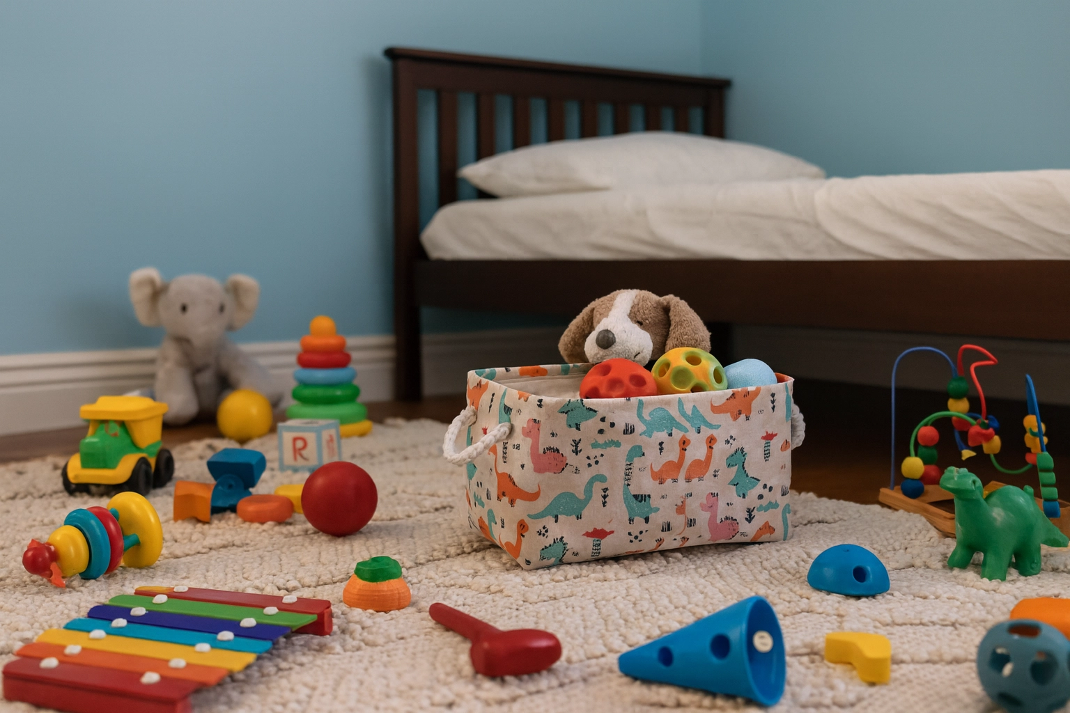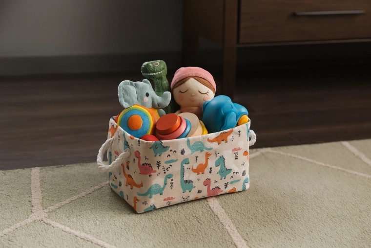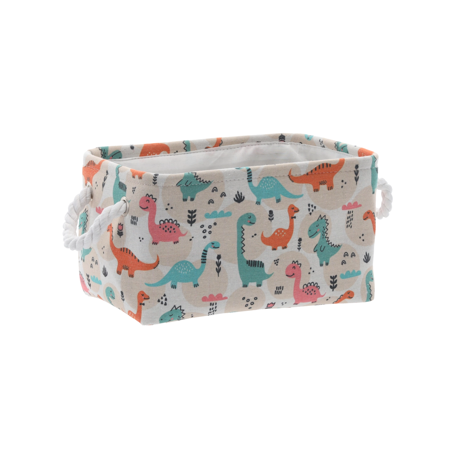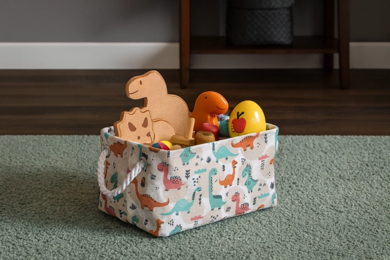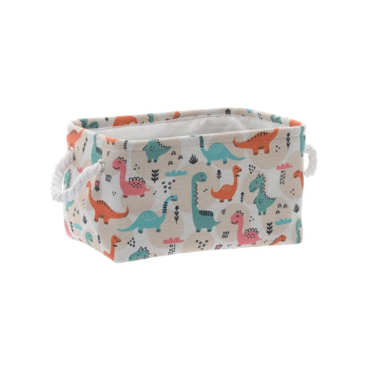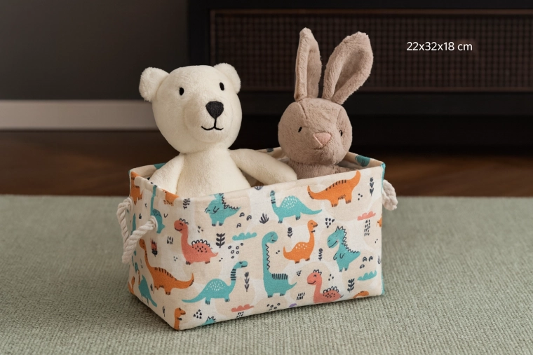 Textilný kôš s farebnými dinosaurami je ideálnou voľbou na prehľadné uloženie hračiek, knižiek aj drobností. Mäkké strany šetria nábytok aj podlahu a otvorený horný vstup umožňuje deťom ľahký prístup. Ľahká, no pevná konštrukcia z odolného polyesteru zvládne každodenné používanie aj časté prenášanie medzi miestnosťami.