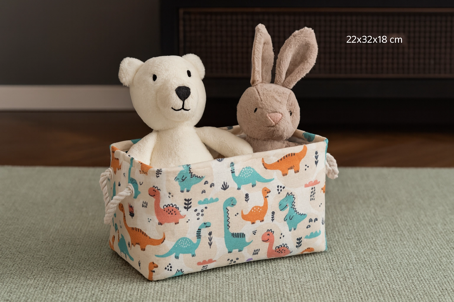 Štýlový a praktický organizér na hračky s motívom dinosaurov pomôže rýchlo skrotiť neporiadok v detskej izbe. Vďaka kompaktným rozmerom 22 × 32 × 18 cm sa zmestí na policu aj do regála, odolný polyester zaistí dlhú životnosť a nízka hmotnosť pohodlné prenášanie. Veselá potlač dinosaurov dodá interiéru hravosť a farby.