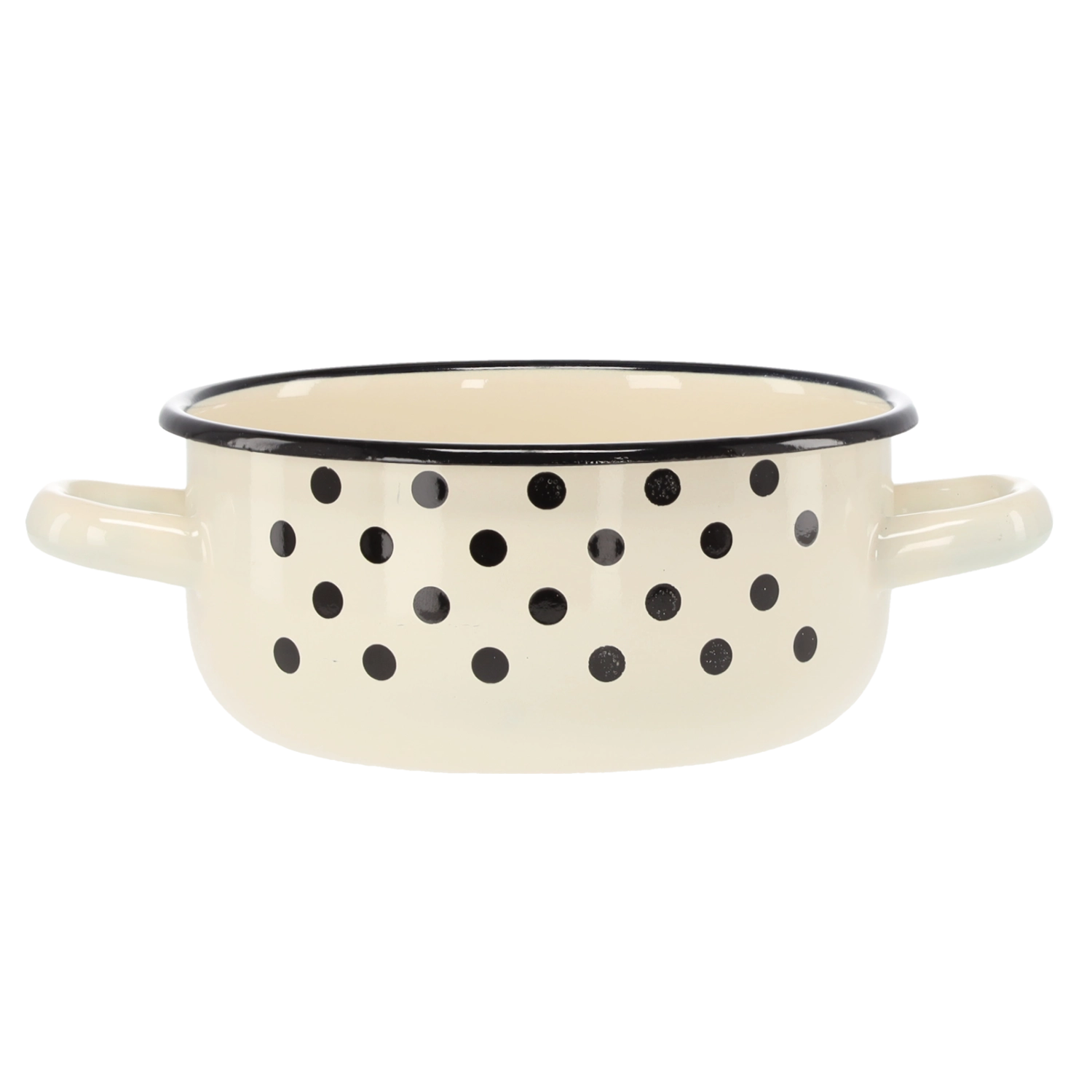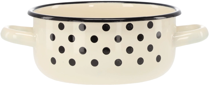 Praktický smaltovaný rajnák s objemom 1,5 l a priemerom 16 cm v elegantnej bielej farbe s dekoratívnymi bodkami. Vďaka dvom ušiam sa s ním pohodlne manipuluje, je ideálny na každodenné varenie, ohrievanie a servírovanie. Odolný smalt, štýlový dizajn a jednoduchá údržba pre radosť z varenia každý deň.