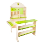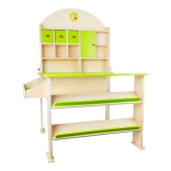 Moderný drevený predajný stánok nielenže rozvíja komunikačné a počtové zručnosti detí, ale tiež podporuje ich kreativitu. Je vybavený úložnými priestormi, ktoré zahŕňajú šikmé police na ukladanie debienok a samostatné police pre makety a tovar. Zadná stena obsahuje odkladacie plochy a skrinky s funkčnými dvierkami. Na vrchole stojana sú hodiny, ktoré deti môžu využiť na učenie času a určenie otváracích hodín.