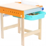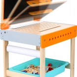 Objavte šikovný detský stôl, ktorý sa jedným pohybom zmení z kresliaceho pultu na pracovný ponk. Sklopný kresliaci panel s poličkou na náradie, pracovná doska s otvormi na uchytenie dielov a držiak papierovej role na boku robia z tohto stola dokonalé miesto na tvorenie aj stavenie.