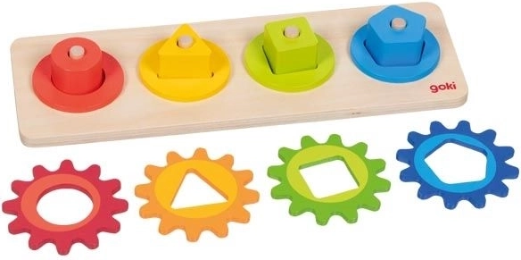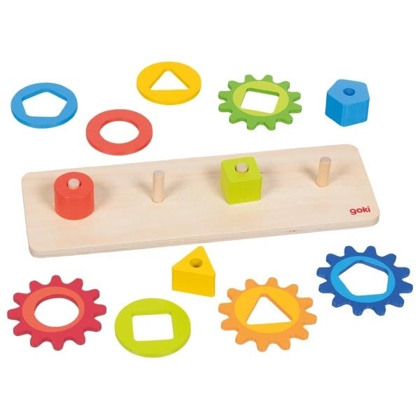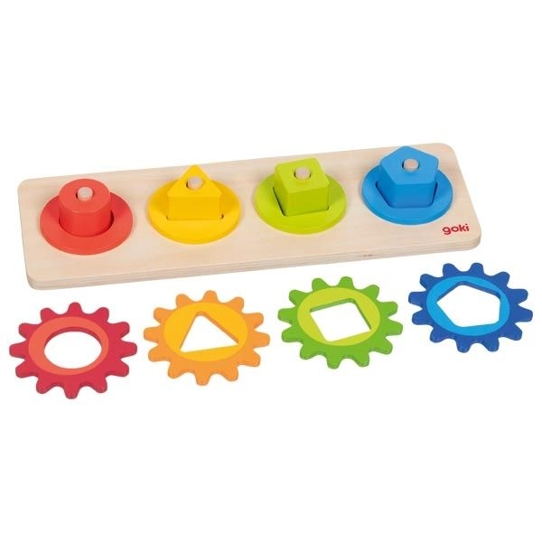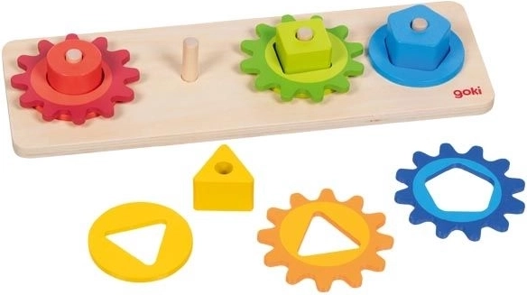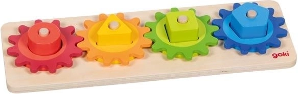 Táto drevená motorická hračka kombinuje vkladanie a triedenie farebných tvarov s otáčaním prepojených ozubených kolies. Deti pri hraní prirodzene skúmajú princíp príčiny a následku – otočia jedným kolieskom a ostatné sa dajú do pohybu. Zábavnou formou tak rozvíjajú zručnosť, trpezlivosť a priestorové vnímanie.