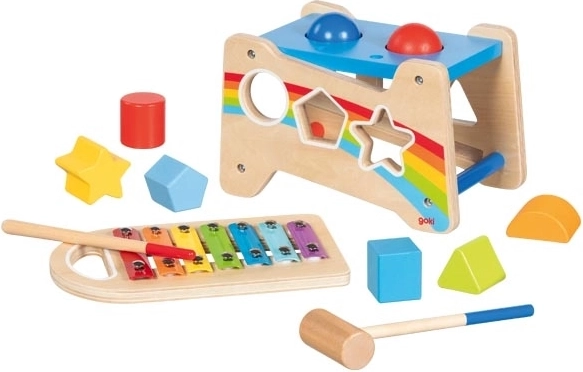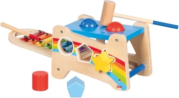 Táto šikovná hračka Goki podporuje deti v objavovaní sveta tvarov, farieb aj zvukov. Zatĺkačka s dvomi guľôčkami zaručí radosť z akcie, zasúvací xylofón premení hru na malý koncert a vkladačka s tvarmi trénuje logiku a koordináciu ruka–oko. Vďaka kompaktným rozmerom sa skvelo hodí do detskej izby aj na cesty.