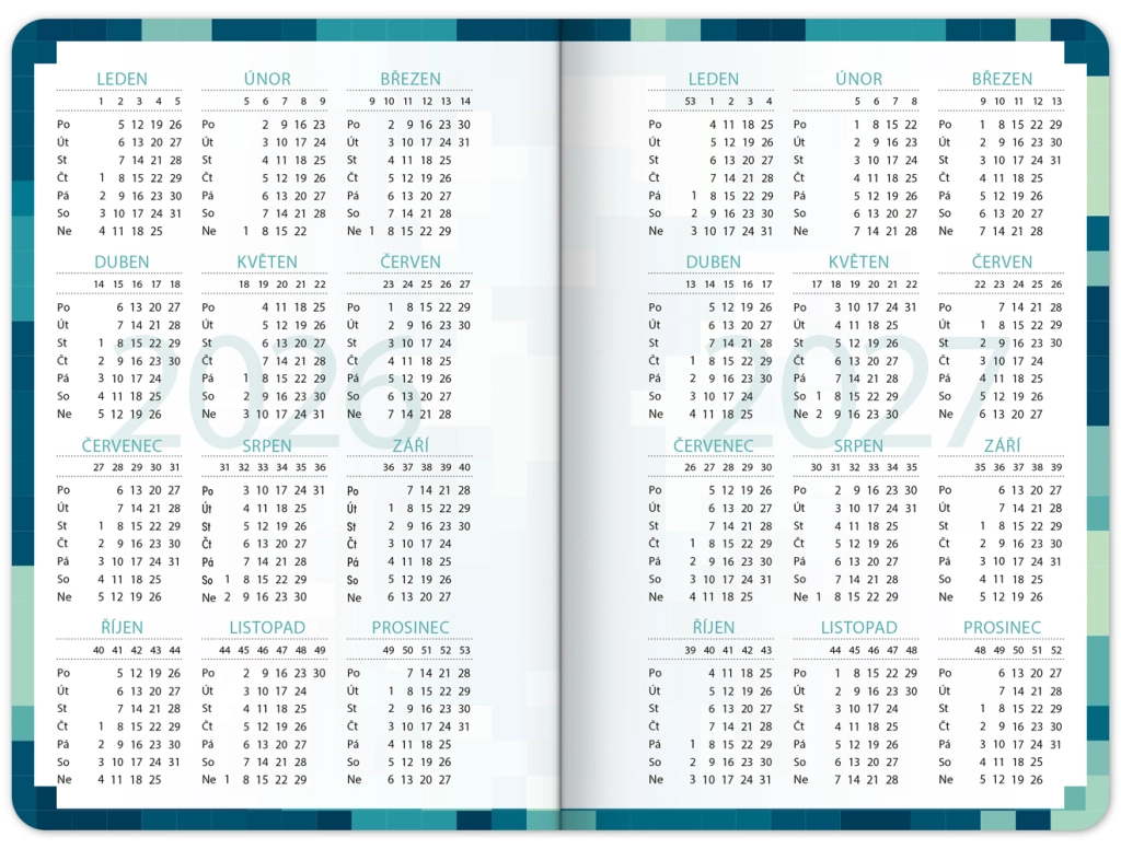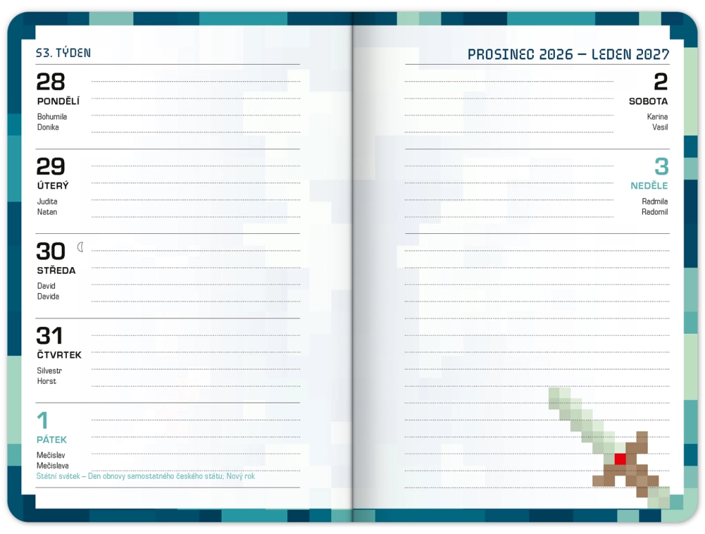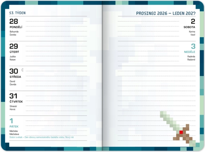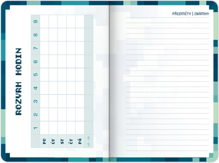 Štýlový školský diár s motívom stavebnej videohry pre prehľadný školský rok od septembra 2026 do decembra 2027. Ponúka praktické ťaháky zo slovenčiny, matematiky a angličtiny, rozvrhy hodín a prehľad prázdnin v kompaktnom formáte 9,8 × 14,5 cm – ideálne do batohu aj tašky.