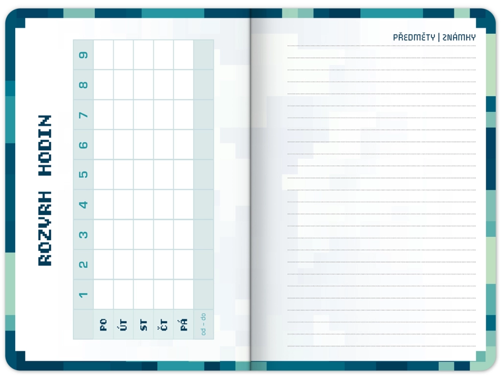 Majte poriadok v školských povinnostiach s diárom Gamer inšpirovaným svetom stavebných videohier. Vďaka prehľadnému členeniu a kompaktným rozmerom sa zmestí do každého batohu a pomôže vám plánovať domáce úlohy, testy aj krúžky.