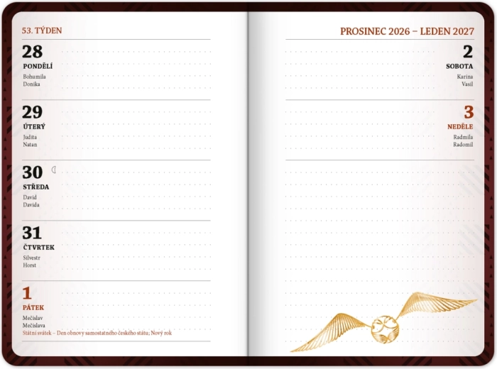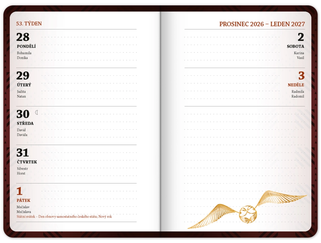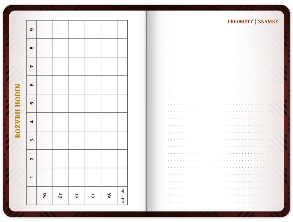 Štýlový študentský diár s motívom HARRY POTTER pre školský rok od septembra 2026 do decembra 2027 v kompaktnom formáte 9,8 × 14,5 cm. Ponúka praktické ťaháky z matematiky, fyziky, chémie a angličtiny, prehľadné rozvrhy hodín a termíny prázdnin – ideálne pre starších školákov a študentov, ktorí chcú mať všetko pod kontrolou.